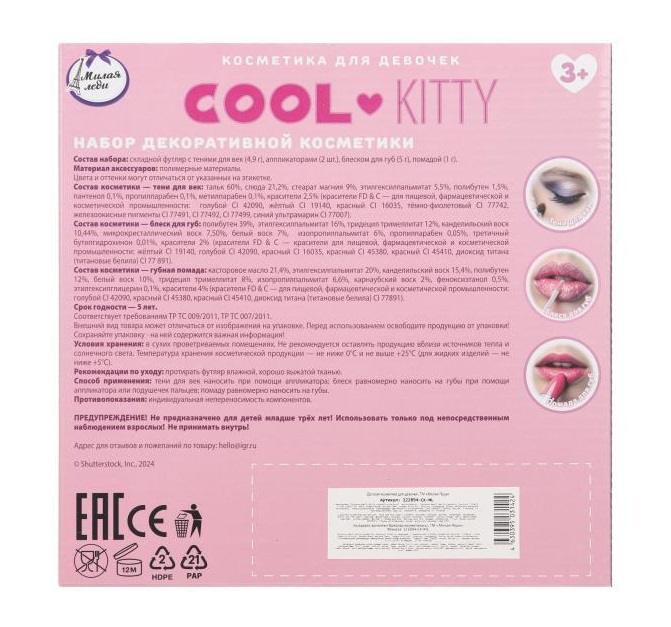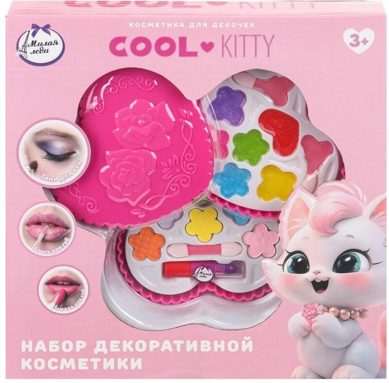 Набор декоративной косметики для девочек «Cool Kitty» ТМ «Милая леди» непременно понравится маленькой моднице: - тени для век 6-ти цветов - блеск для губ 6-ти цветов - помада для губ - 3 аппликатора для нанесения макияжа - двухъярусный оригинальный складной футляр в виде сердца - красочная упаковка с милым персонажем Девочки в любом возрасте хотят быть красивыми. Специально для юных модниц был разработан этот набор, состоящий из теней для век, помады и блесков для губ в красивом футляре. Маленькая принцесса обязательно оценит красочные цвета, волшебный блеск и модную упаковку с очаровательной кошечкой-модницей. Развивайте чувство стиля и вкуса, учите девочку создавать свой неповторимый образ вместе с косметикой ТМ «Милая леди». Размер: 28 х 20,5 х 3,8 см. Материал аксессуаров: пластик. Материал упаковки: пластик + картон. Цвета и оттенки могут варьироваться в зависимости от наполнения набора. Рекомендовано детям от 3-х лет.