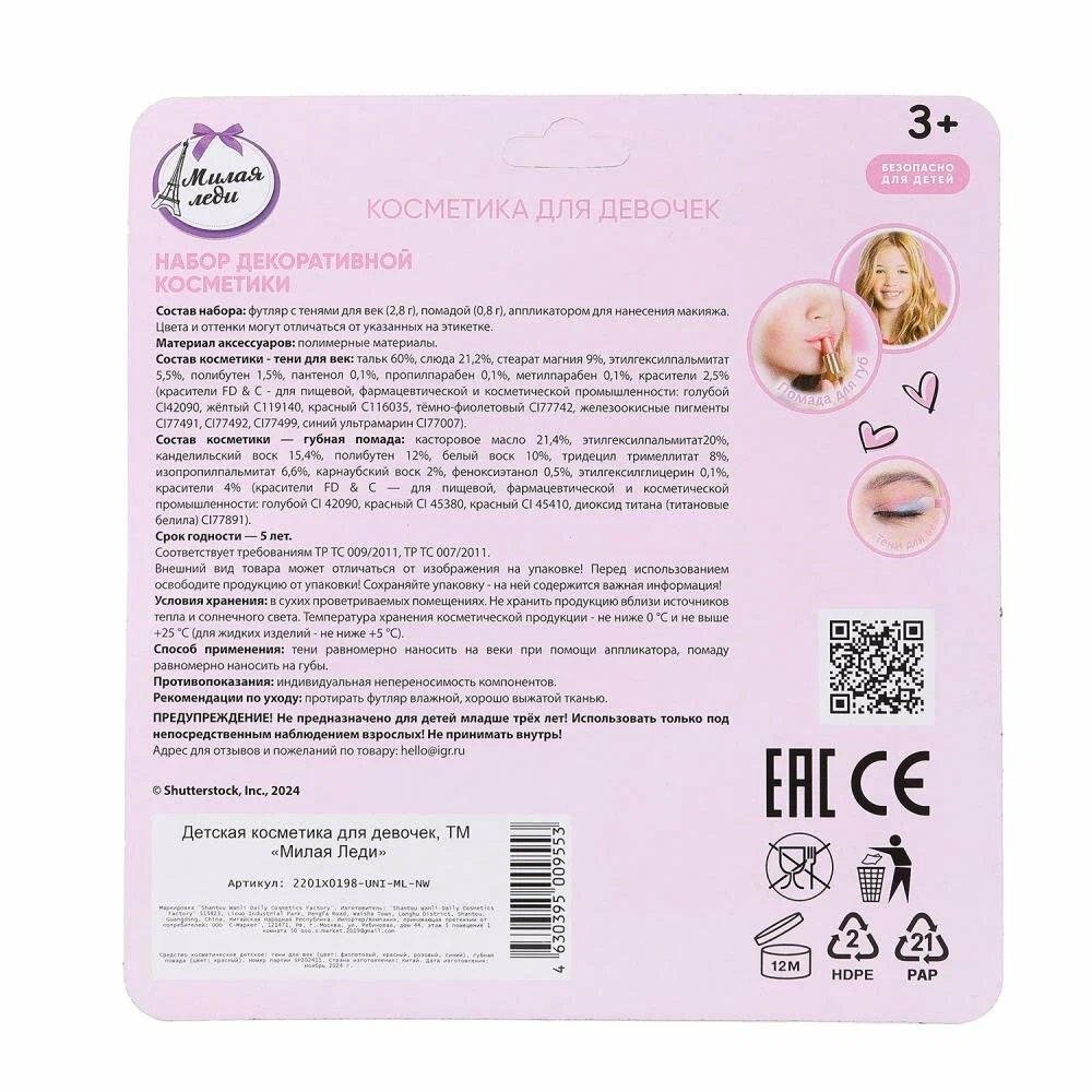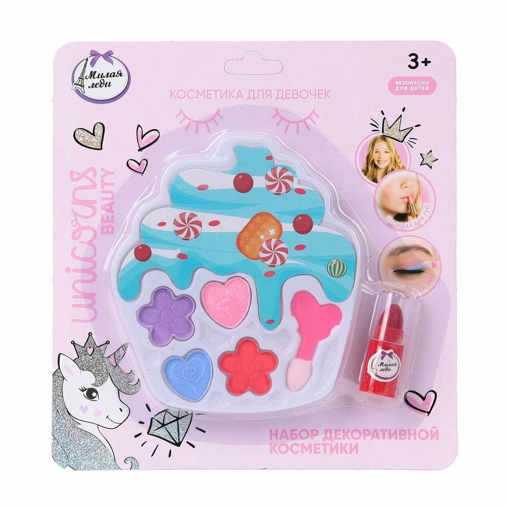 Девочки в любом возрасте хотят быть красивыми. Специально для юных модниц был разработан этот набор, состоящий из теней для век в красивом футляре и помады для губ. Маленькая принцесса обязательно оценит красочные цвета и модную упаковку с милым единорогом. Развивайте чувство стиля и вкуса, учите девочку создавать свой неповторимый образ вместе с косметикой ТМ «Милая леди».