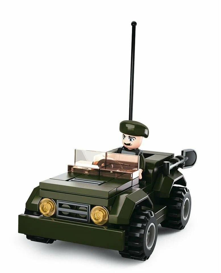 Рекомендовано детям от 6 лет. Конструктор в виде военного джипа зеленого цвета с фигуркой водителя. Все детали выполнены из прочного и безопасного пластика. Развивает усидчивость, мелкую моторику и воображение. Для детей старше 6 лет.
