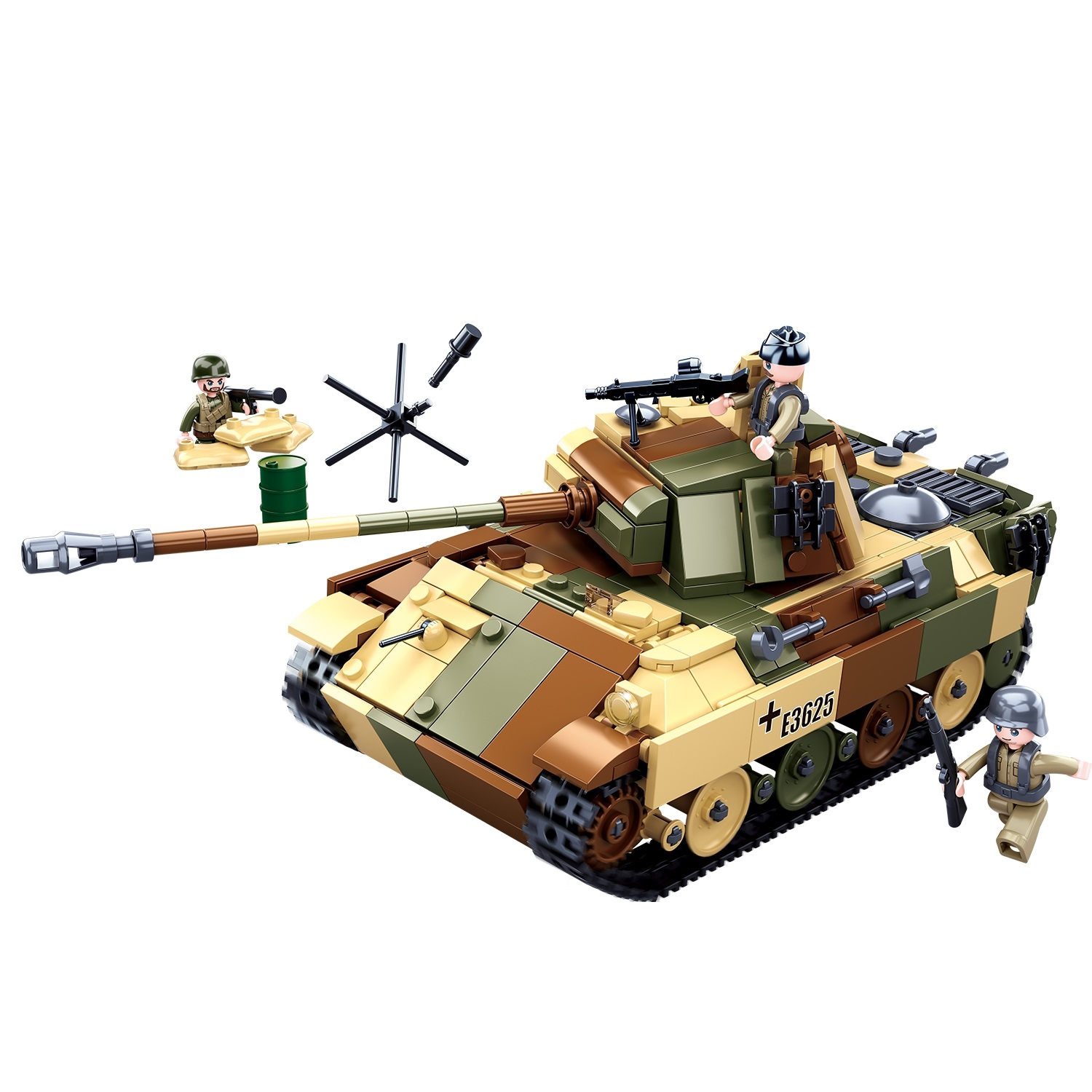 Большой тематический конструктор из 725 деталей, соединив которые у вас получится собрать танк Пантера V. Танк отличается хорошей детализацией и схожестью с оригинальной моделью. В наборе также есть фигурки военных, дополняющие сцену.