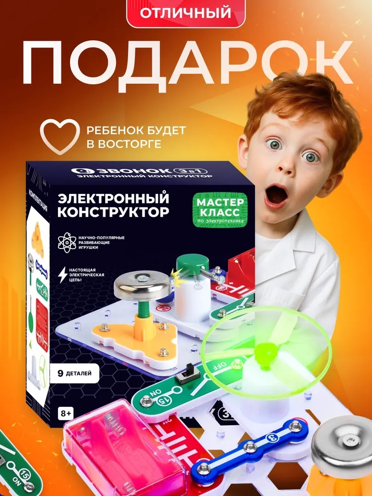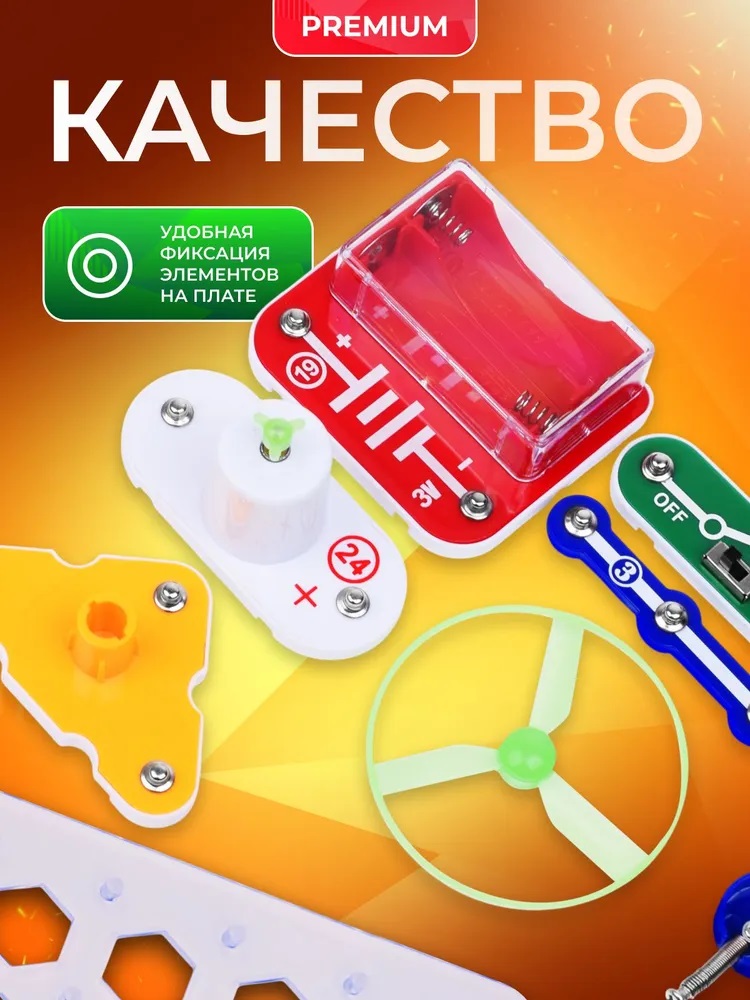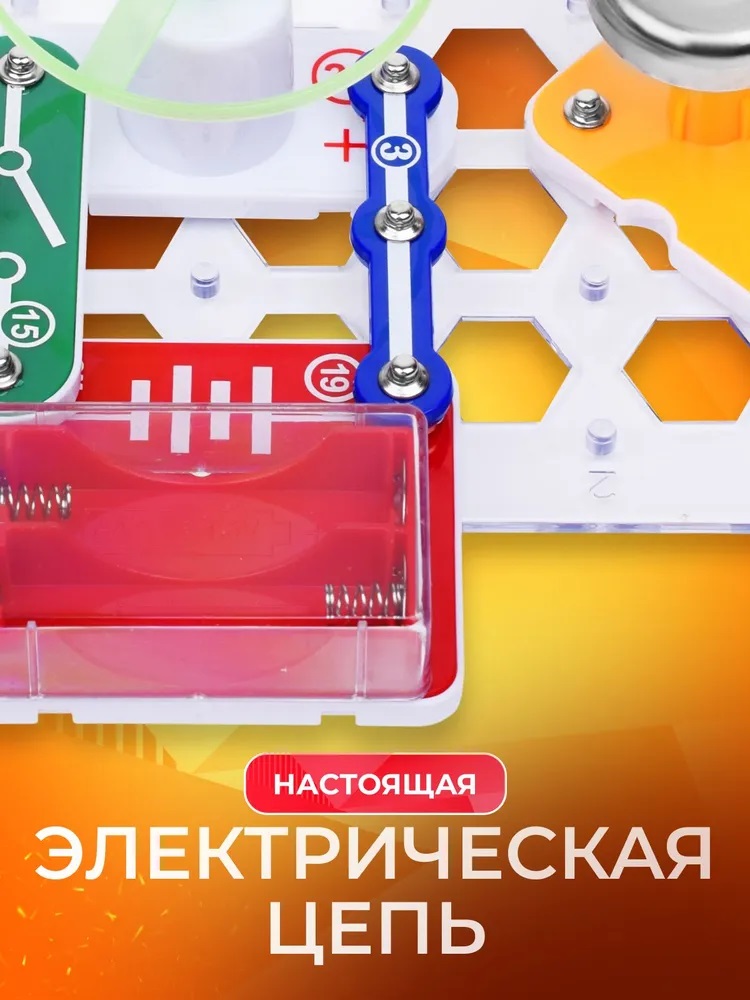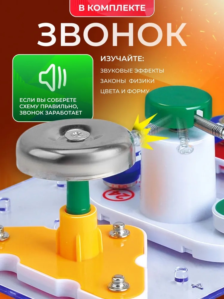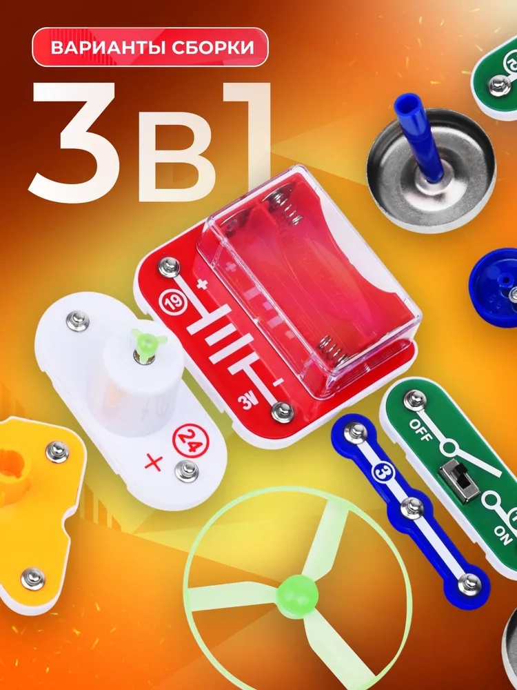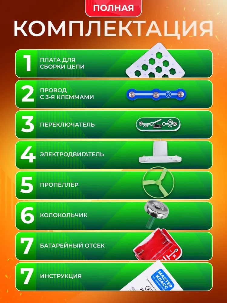 • В наборе:- плата для сборки цепи (11х14 см.)- провод с 3-я клеммами.- переключатель.- электродвигатель.- пропеллер.- колокольчик.- батарейный отсек.- инструкция.• Для работы нужны 2 батарейки АА (не входят в комплект)• Для детей от 8 лет.