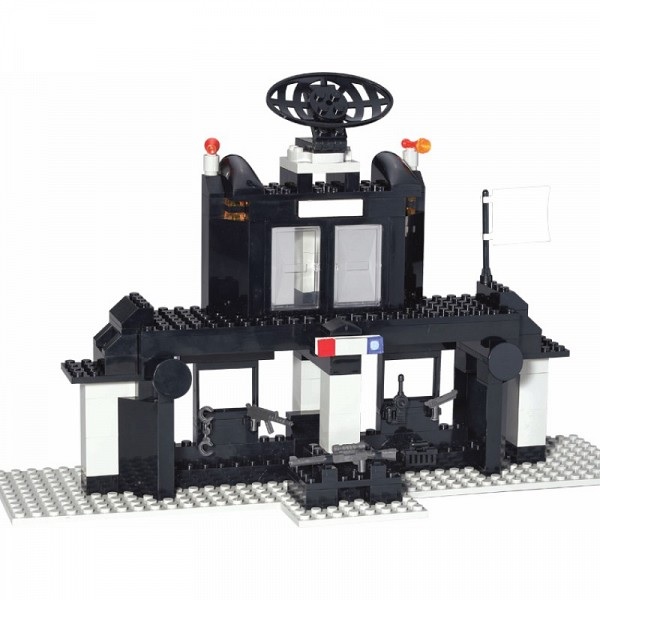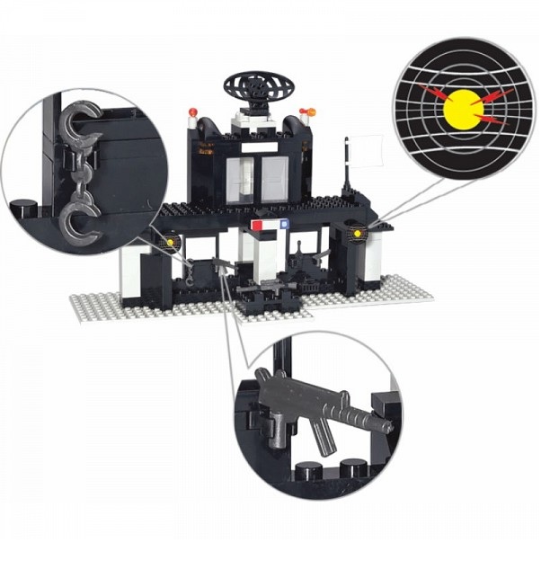 Основным элементом комплекта станет постройка, напоминающая фасад здания полицейского участка. Преобладающим цветом в ее оформлении является черный, поэтому архитектурное сооружение выглядит очень стильно. На его крыше установлены характерные декоративные атрибуты, выполненные в виде спутниковой антенны и прожекторов.