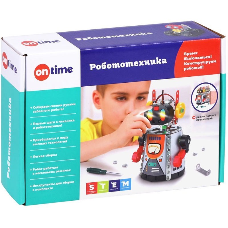 Конструктор Роботехника On time 45101. С игровым конструктором ТМ "ON TIME" ребенок сделает первые шаги в механике и робототехнике! Юный инженер легко и с удовольствием соберет забавного робота, а потом проверит его возможности, нажав на кнопку включения. Все необходимые инструменты для сборки включены в комплект.