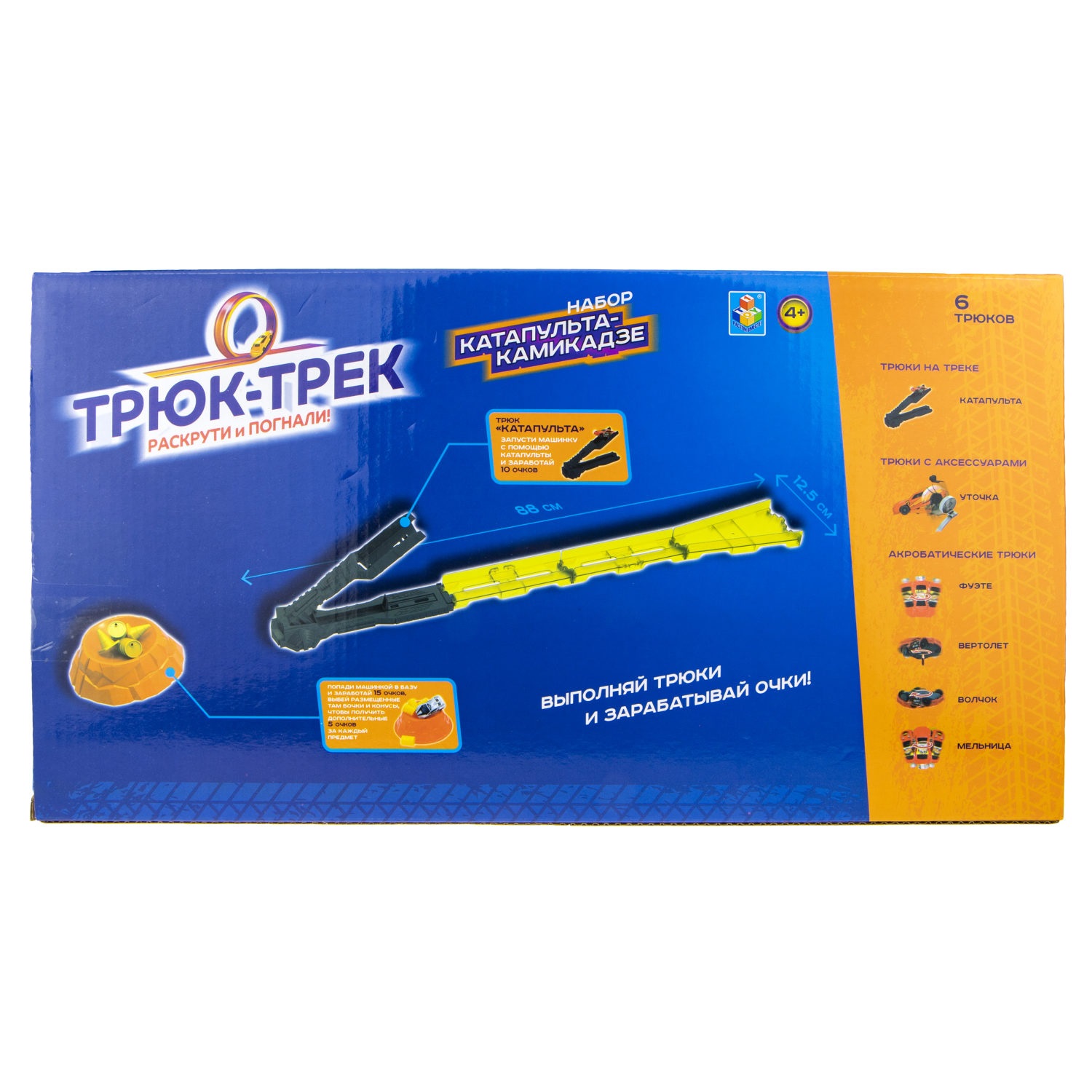 Набор Катапульта-камикадзе с крутой трассой и 1 гоночной машиной с заменяемым корпусом и фрикционным двигателем с маховиком. Собери машину, поставь на трассу и наблюдай, как она проходит препятствия. Можно выполнять 6 трюков. Развивает скорость 190 км/ч. Длина трека 1 метр.