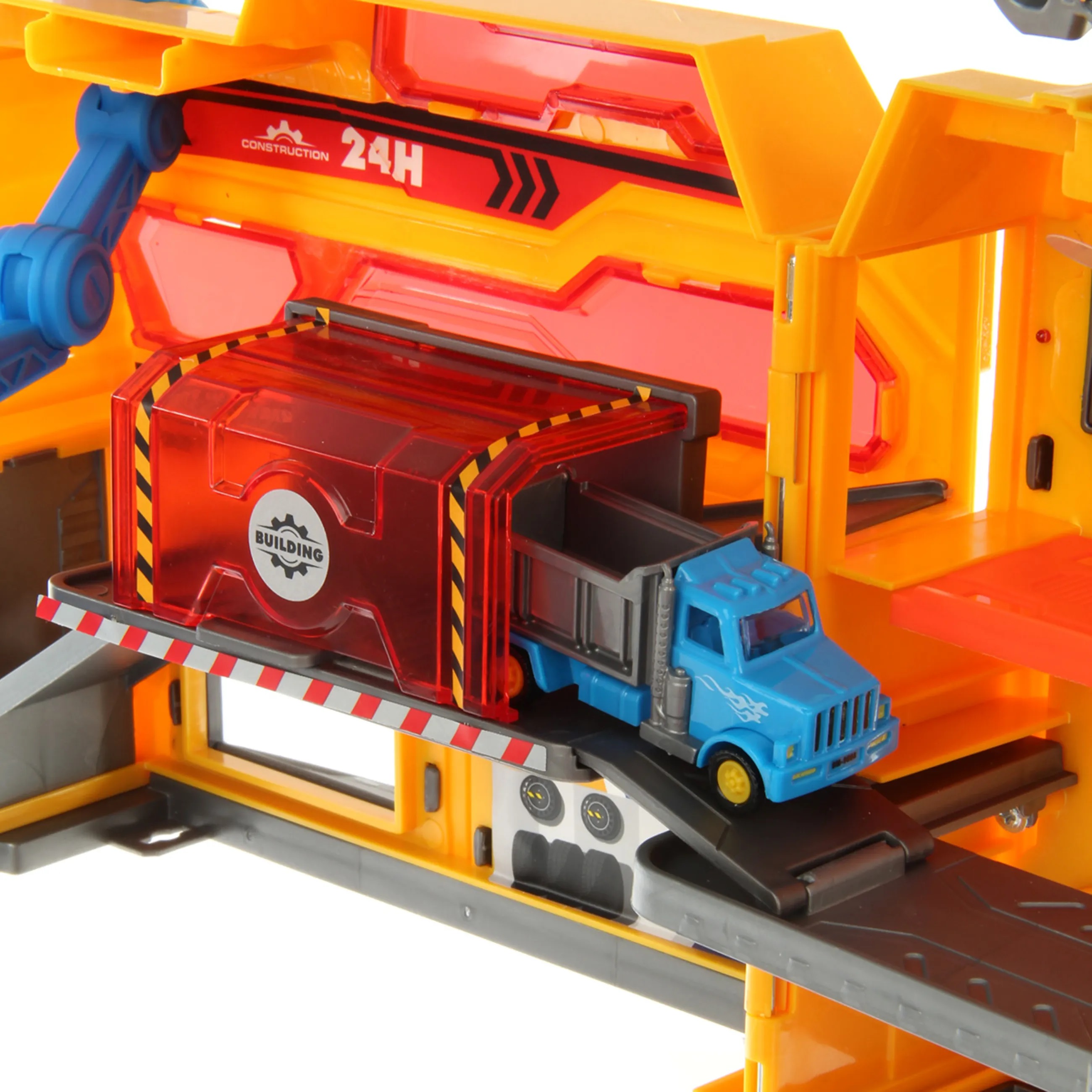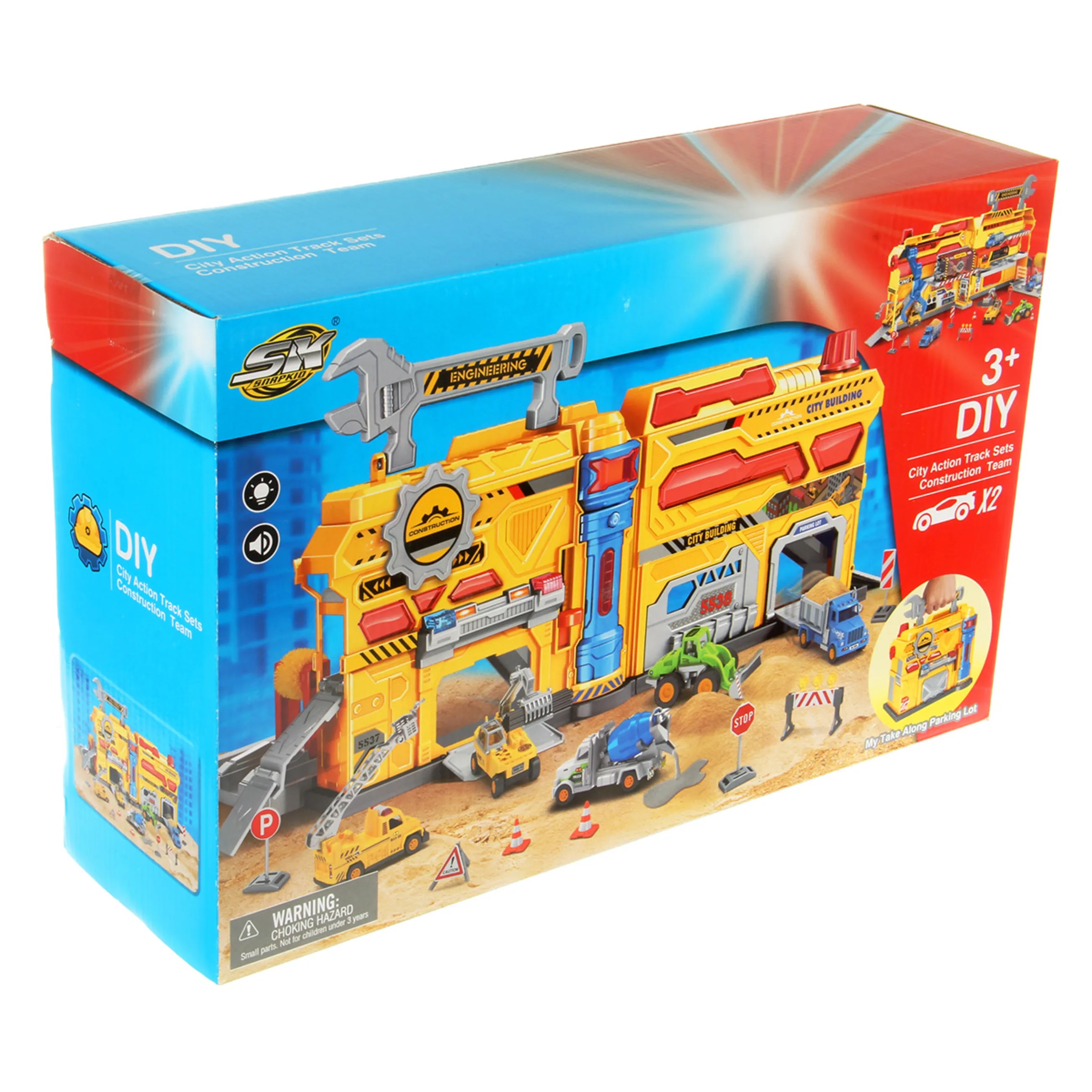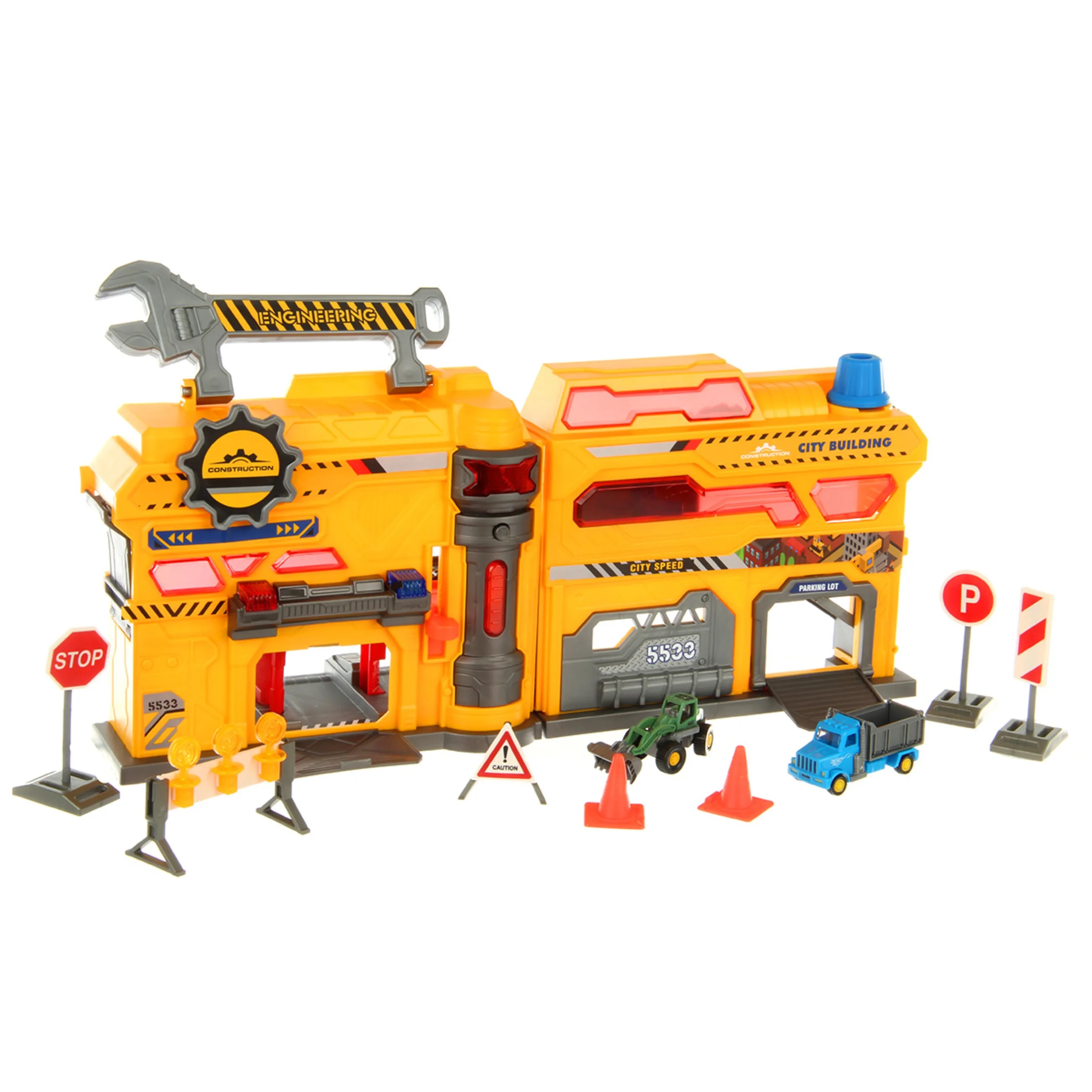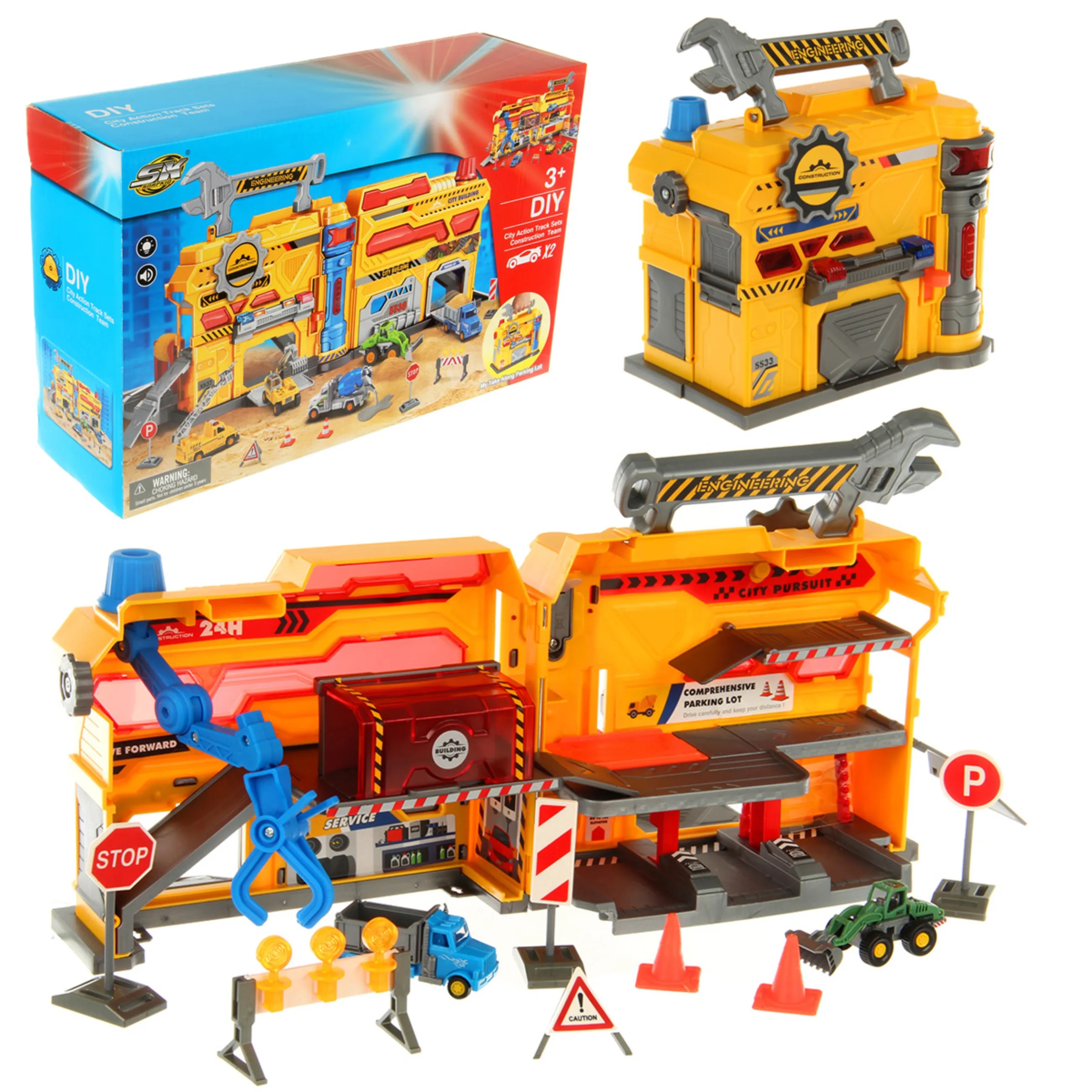 Парковка Строительная станция со светом и звуком, это роскошный набор, в котором есть все для увлекательных игр. Гараж для машинок детский, паркуем автомобили, передвижной лифт, манипулятор с захватом для перемещения транспорта, площадка с имитацией автомойки, набор дорожных знаков и машинок. Все предметы компактно помещаются в чемоданчике, который удобно взять с собой на улицу и играть с друзьями. Парковка стройка изготовлена из прочных и безопасных материалов. Набор с машинками и дорожными знаками оформлен в оригинальном дизайне и красивой расцветке. Парковка для машинок с надежным креплением деталей и продуманной конструкцией. Парковка строительная площадка с машинками поставляется в подарочной упаковке. Парковка с машинками и аксессуарами станет замечательным подарком для ребенка на Новый год и День рождения, подойдет для ребят разного возраста. В игровой форме ребенок познакомится с профессией строителя, служебным транспортом, правилами дорожного движения. В комплекте строительная станция, 2 машинки, 5 дорожных знаков, 2 конуса, наклейки, инструкция на английском языке. Игрушечный транспорт катается вперед и назад, днища металлические. У трактора поднимается и опускается механизм с ковшом, ковш поднимается и опускается, за счет строения передних колес трактор может поворачивать. Игрушка Стройплощадка имеет функционал. 1. Парковка в виде чемоданчика открывается и закрывается, закрывается на замочек в виде шестеренки, открывается прокруткой шестеренки. 2. При нажатии на круглую кнопку на лицевой стороне парковки издает звуки строительства и сирены, лампочка над кнопкой подсвечивается. 3. Дверки парковки открываются, внутренние горки поднимаются и опускаются. 4. Есть лифт платформа, перемещается вверх и вниз за счет передвижения оранжевой лапки с лицевой стороны парковки. 5. В гараже, прозрачный красный пластиковый корпус, есть передвигающаяся влево и вправо платформа. Движение производится за счет перемещения ручки с внешней стороны красного пластикового корпуса. 6. Есть манипулятор для машинок, стрела складывается и раскладывается, захват крутится, можно зажать в захвате машинку. Стрела поворачивается за счет прокрутки кнопки на крыше парковки. 7. Из парковки выдвигается платформа с мойкой машинок, при проезде машинок губка крутится, щетки открываются. 8. Есть ручка в виде гаечного ключа, удобно переносить чемоданчик. У дорожного знака Внимание раскладывается ножка. 10 предметов. Детский гараж парковка работает от 3 батареек LR44, входят в комплект. Игрушка на батарейках изготовлена из полимера, металла. Размеры парковки в разложенном виде с горками 50х23х19 см. Размеры парковки в сложенном виде 21х13х19 см. Высота с учетом поднятой ручки 22 см. Размеры трактора с опущенным ковшом 7х3х3 см. Размеры трактора с поднятым ковшом 6х3х5 см. Размеры знака Стоп 4х2х8 см. Размеры конуса 2х3 см. Размеры коробки 43х13х28 см.
