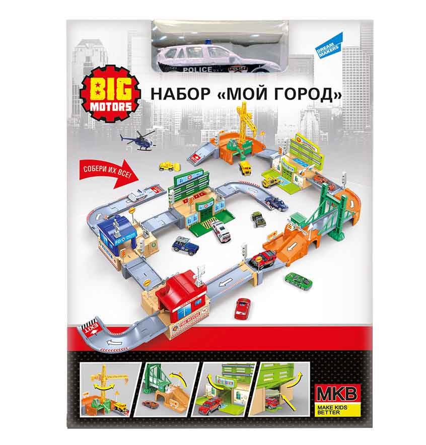 Набор игровой Мой город Big Motors 0607-14. Линейка «Мой город» представляет собой серию сюжетно-ролевых наборов для детей, каждый из которых включает в себя часть города и металлическую машинку. Можно построить стройку, подвесной мост пожарную станцию, полицейскую станцию, больницу, парк развлечений. Все наборы объединяются между собой. Особенности наборов – подвижные элементы.