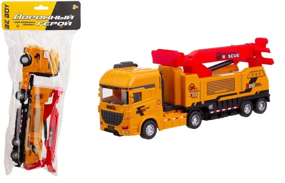Машинка снабжена инерционным механизмом. Также у машинки имеются подвижные элементы: кран вращается на 360 градусов, поднимается/опускается, кабина грузовика поворачивается относительно прицепа.