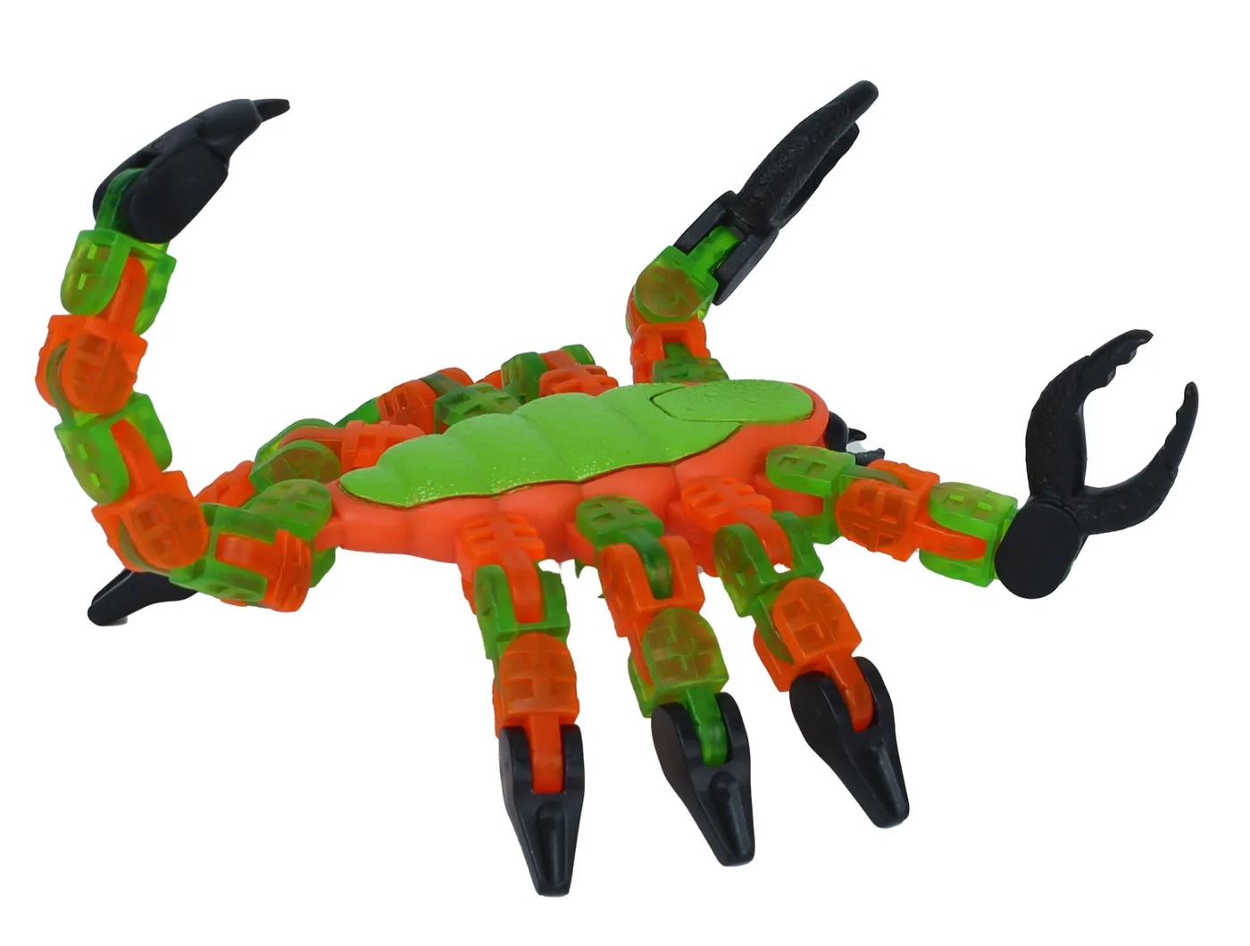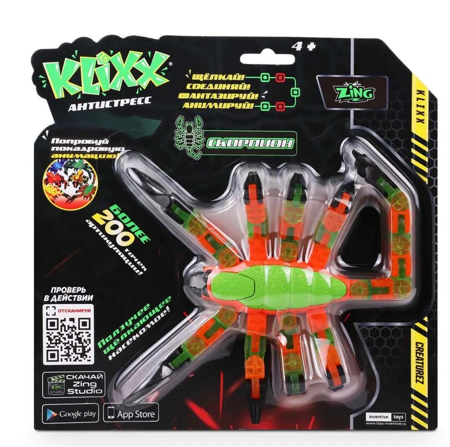 Klixx: Антистресс - игрушка с уникальным дизайном и волшебством. Приветствуйте Klixx Creatures, вашего верного спутника в играх! Эти необычные создания представляют собой жуткие и в то же время увлекательные перевоплощение классических фиджет - игрушек, гарантированно помогая вам увлечься игрой с ними. Каждый приятный щелчок, когда их лапки или туловище защелкиваются, создает умиротворяющий звук, который притягивает ваше внимание и расслабляет. Особенности: - Жуткий и мистический дизайн: Вас ждут 6 вариантов с двумя уникальными цветовыми решениями: Паук, Скорпион, Огненный муравей, Питон, Кобра и Гремучая змея. Каждое существо обладает интригующей формой и стилем, который точно привлечет ваше внимание. - Творческий эксперимент: Разбирайте и собирайте их в бесконечных комбинациях, создавая удивительные формы и структуры, чтобы утолить вашу жажду творчества. - Анимационное волшебство: С помощью приложения Zing Studio вы сможете оживить своих существ, создавая уникальные анимационные ролики, вдохновляя фантазию ребенка. - Универсальное решение для релаксации: Klixx отлично подходят как для детей, так и для взрослых. Они подарят вам возможность расслабиться и увлечься в любом месте и в любое время, будь то в очереди, в автомобиле или в ожидании ужина. - Обучение и творчество: Эти игрушки также являются прекрасным инструментом для обучения и развития творческих навыков. С Klixx Creatures вы получите не только забавный способ борьбы со стрессом, но и уникальное средство самовыражения и релаксации. Давайте создадим вместе свой мир удивительных моментов и креативных приключений вместе с Кликс!