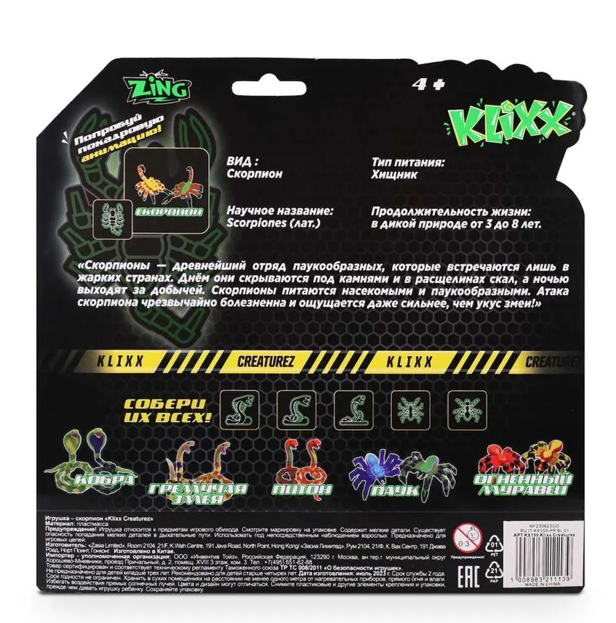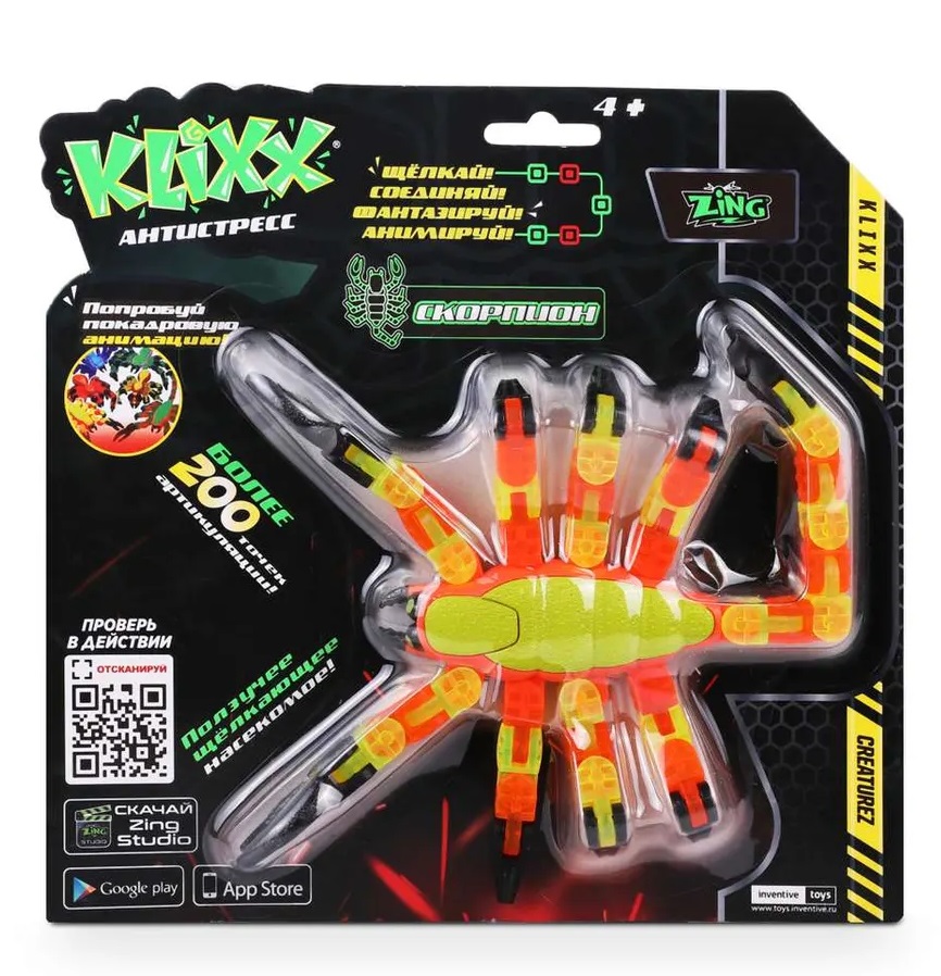 Klixx: Антистресс - игрушка с уникальным дизайном и волшебством. Приветствуйте Klixx Creatures, вашего верного спутника в играх! Эти необычные создания представляют собой жуткие и в то же время увлекательные перевоплощение классических фиджет - игрушек, гарантированно помогая вам увлечься игрой с ними. Каждый приятный щелчок, когда их лапки или туловище защелкиваются, создает умиротворяющий звук, который притягивает ваше внимание и расслабляет. Особенности: - Жуткий и мистический дизайн: Вас ждут 6 вариантов с двумя уникальными цветовыми решениями: Паук, Скорпион, Огненный муравей, Питон, Кобра и Гремучая змея. Каждое существо обладает интригующей формой и стилем, который точно привлечет ваше внимание. - Творческий эксперимент: Разбирайте и собирайте их в бесконечных комбинациях, создавая удивительные формы и структуры, чтобы утолить вашу жажду творчества. - Анимационное волшебство: С помощью приложения Zing Studio вы сможете оживить своих существ, создавая уникальные анимационные ролики, вдохновляя фантазию ребенка. - Универсальное решение для релаксации: Klixx отлично подходят как для детей, так и для взрослых. Они подарят вам возможность расслабиться и увлечься в любом месте и в любое время, будь то в очереди, в автомобиле или в ожидании ужина. - Обучение и творчество: Эти игрушки также являются прекрасным инструментом для обучения и развития творческих навыков. С Klixx Creatures вы получите не только забавный способ борьбы со стрессом, но и уникальное средство самовыражения и релаксации. Давайте создадим вместе свой мир удивительных моментов и креативных приключений вместе с Кликс!