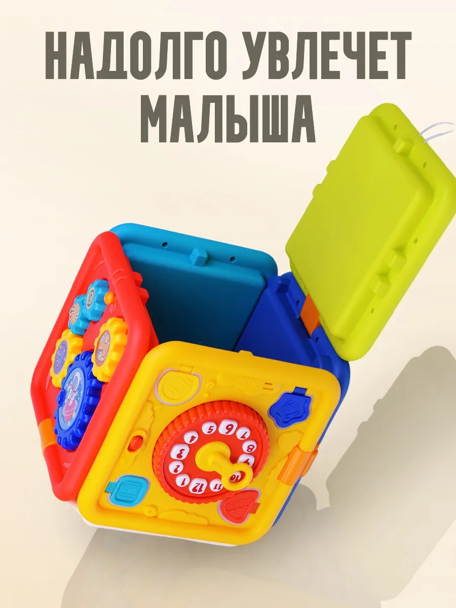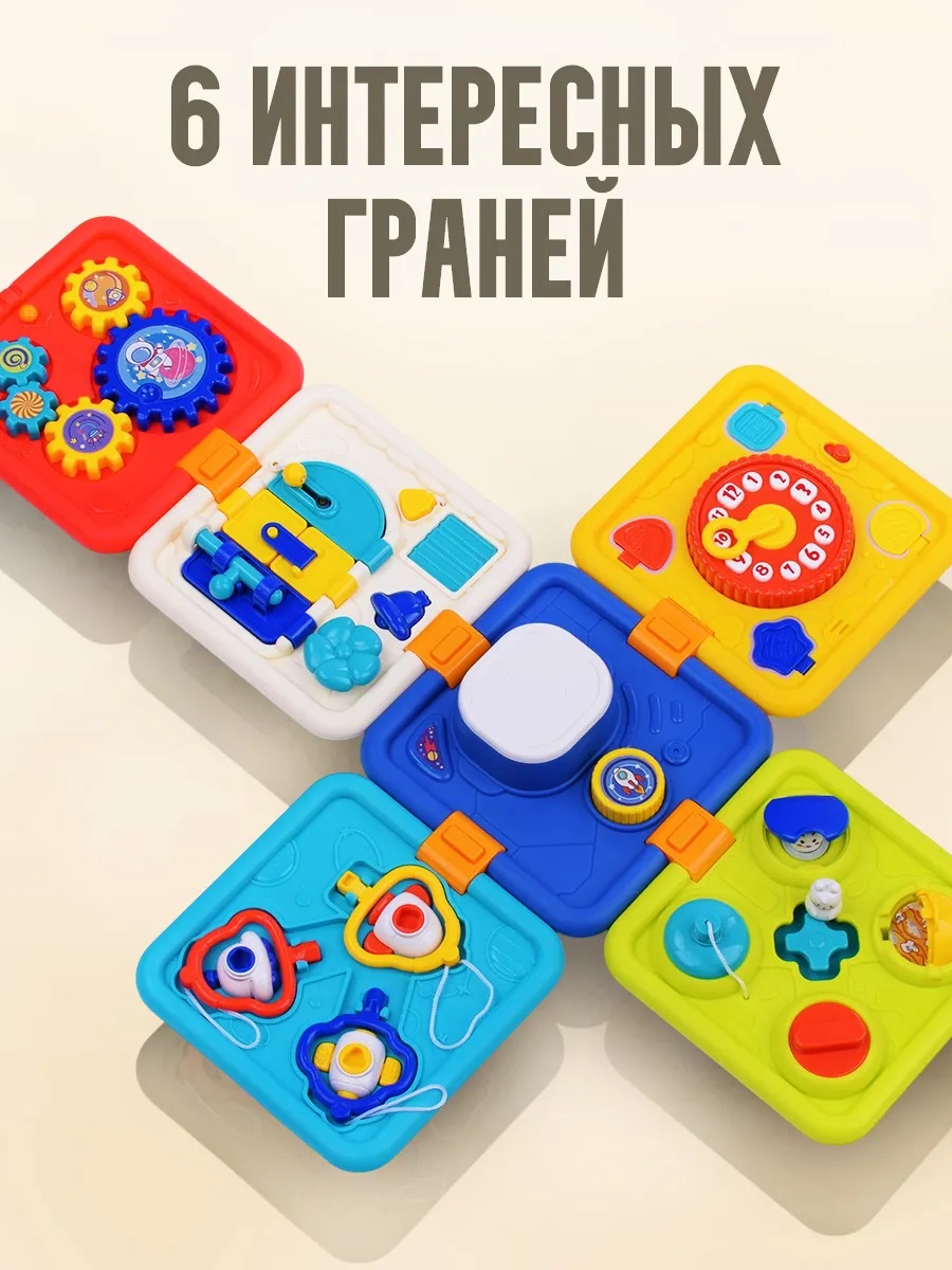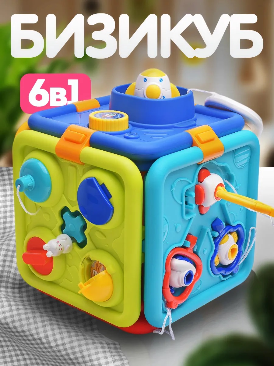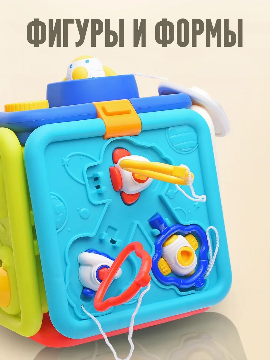 Представляем вашему вниманию многофункциональный игровой центр для малышей — развивающий бизикуб. Эта игрушка для малыша 6 в 1 станет отличным помощником в развитии воображения, логики и моторики. Каждая из шести сторон куба предлагает весёлые игры и головоломки, которые увлекут ребёнка и помогут ему изучать окружающий мир через игру. Бизиборд предложит вашему малышу разные тематические площадки: космическую станцию с элементами космодрома и ракет, где ракета может быть запущена нажатием кнопки; панель с забавными зверьками, которые будут сопровождать процесс изучения; часики с циферблатом, стрелку которого можно крутить — они помогут познакомиться со временем. Когда стрелка попадает на 3, 6, 9 или 12 часов, загораются цифры и звучит обучающая фраза на английском языке о распорядке дня. Детские часы работают от 3 - х мизинчиковых батареек ААА ( в комплект не входят ). Кроме того, на одной из сторон есть панель с дверцами, которые малыш может открывать. Это занятие позволит развивать мелкую моторику. Также там предусмотрена возможность приподнять жалюзи у окошка. Такой подход делает игровой центр не только интересным местом для развлечений, но и полезным инструментом обучения. Все шесть съемных сторон легко соединяются в одну игровую панель. Чтобы собрать или разобрать части обратно в куб достаточно нажать специальную кнопку — система спроектирована так, чтобы ребёнок мог справиться с этой задачей самостоятельно или под присмотром взрослых. Таким образом, этот уникальный многофункциональный игровой центр предоставляет всё необходимое для того, чтобы ваш малыш полноценно развивался через игру. Развивающий музыкальный бизикуб станет надёжным спутником вашего ребёнка в его первых открытиях и радостях освоения новых навыков! Это универсальная игрушка, как бизиборд для мальчиков, так и бизиборд для девочек.