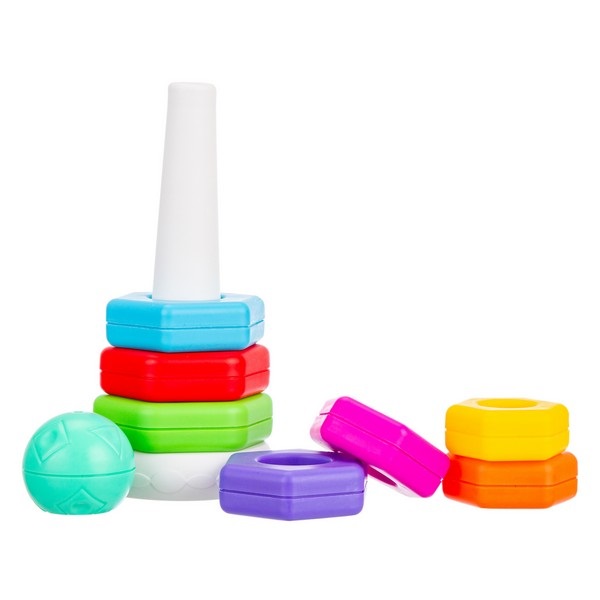 Кольца пирамидки сделаны в форме шестиугольника, что делает их похожими на большие объемные яркие цветные гайки.