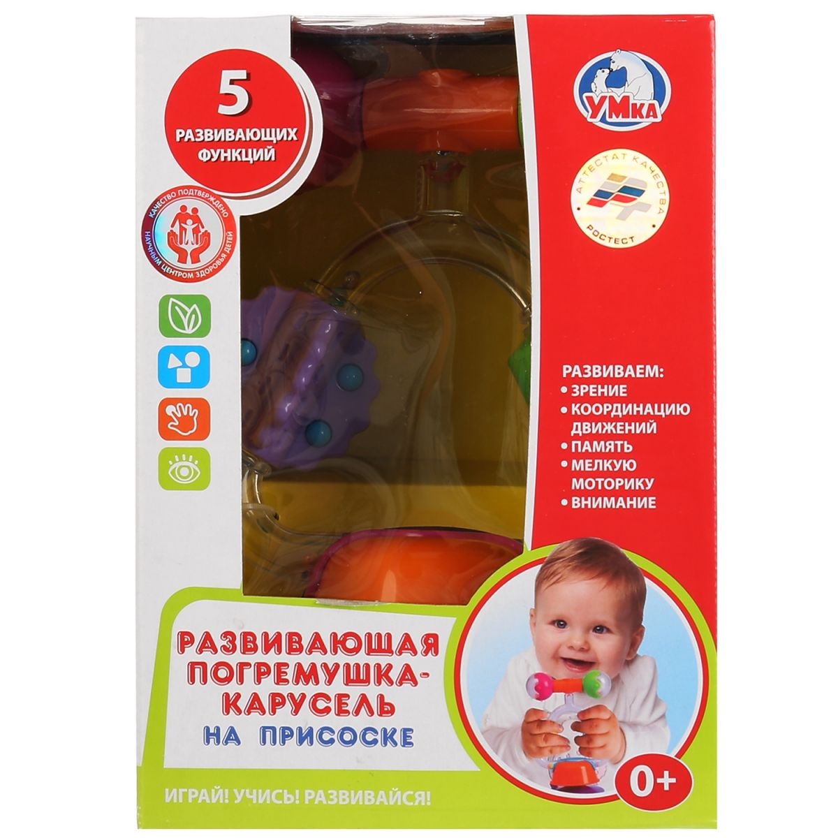 Погремушка-каруселька "УМКА" с множеством подвижных элементов предназначена для раннего развития ребёнка. Каруселька крутится по кругу, дополнительно яркие элементы вращаются вокруг своей оси. Очень удобный функционал - присоска, с помощью которой можнозафиксировать игрушку и она не упадёт во время игры. Погремушка выполнена в ярких цветах и весело гремит, что обязательно привлечёт внимание малыша. Игрушка разовьёт слуховое и зрительное восприятие, память, мелкую моторику и внимание ребёнка. Рекомендовано детям с 0 лет. Упаковка - коробка с прозрачным окном.