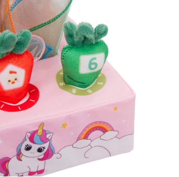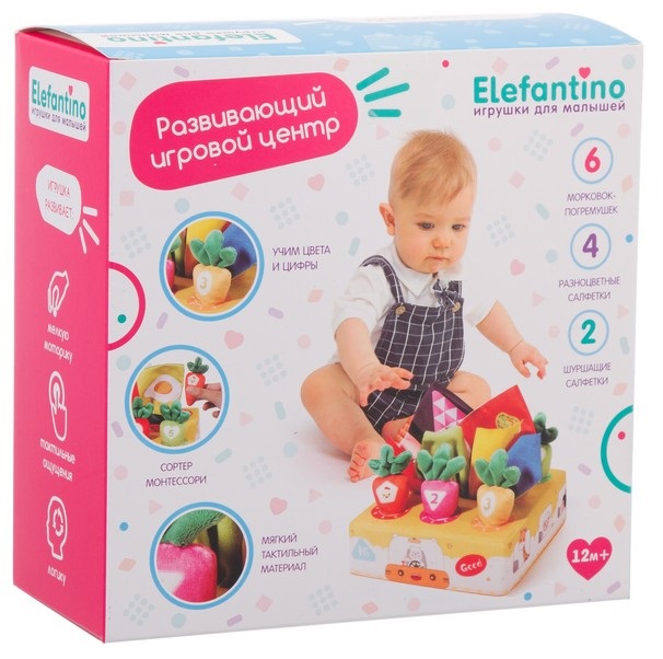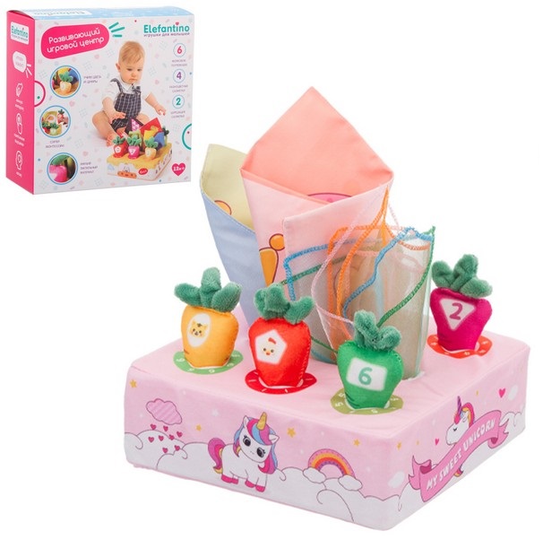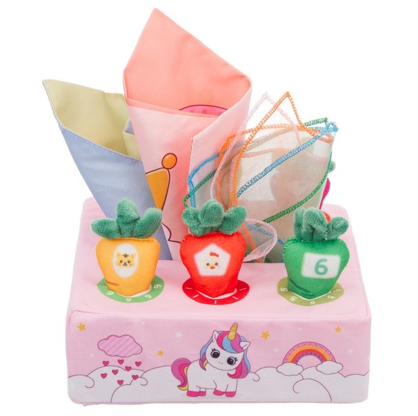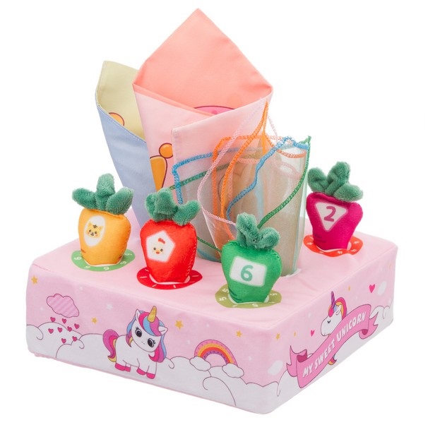 Игрушка выполнена из текстиля в виде поля, в которое можно сажать разноцветные морковки. В комплекте: 6 мягких морковок, 4 разноцветных салфеток и 2 шуршащие салфетки.
