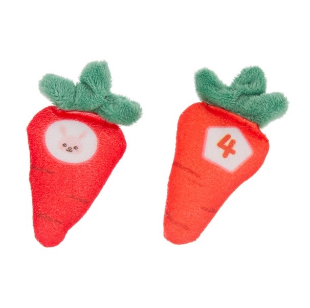 Морковки одновременно выполняют функцию погремушки, элементов сортера и наглядного счетного материала - на их поверхности нанесены геометрические формы и цифры. Также малыш может изучать цвета.