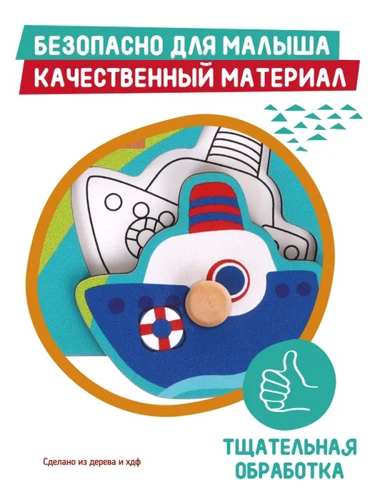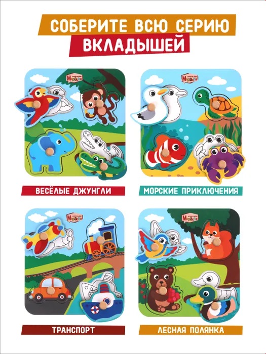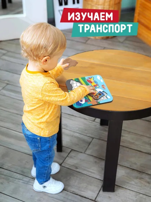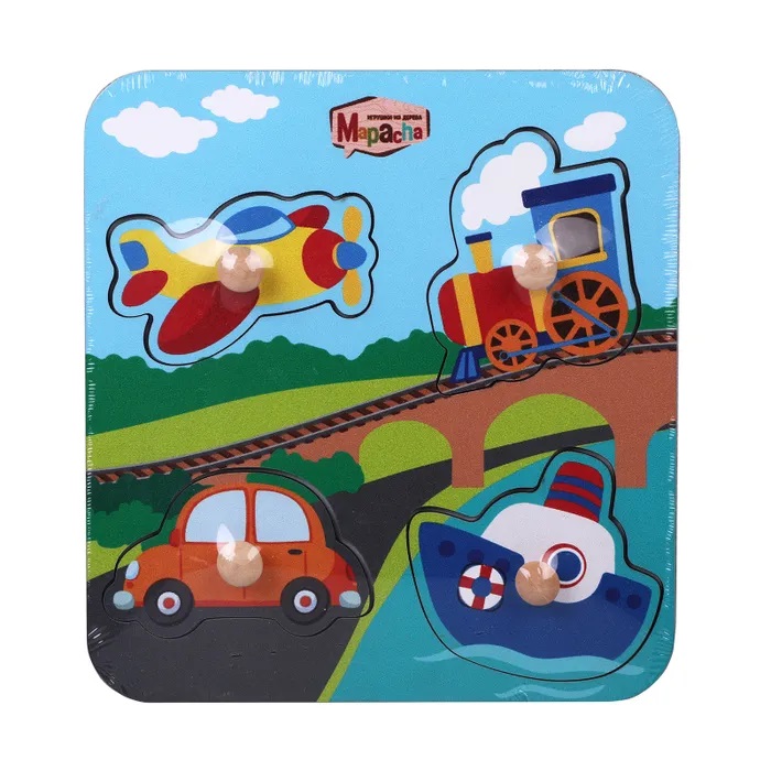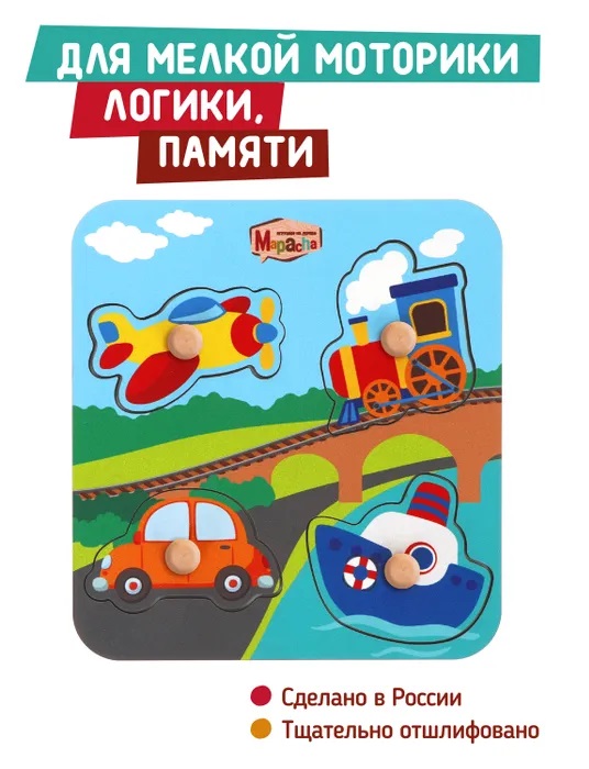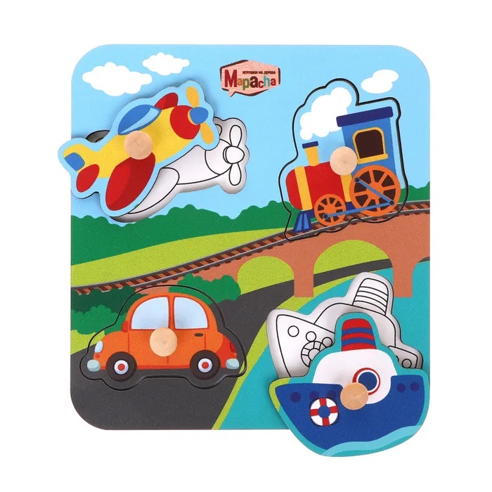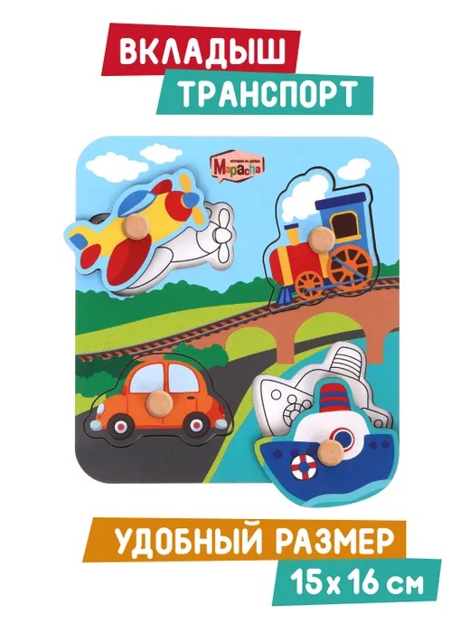 Вкладыши «Транспорт» – очень интересная игрушка-головоломка! Она способствует развитию у малышей логического мышления и воображения, тренирует мелкую моторику рук и умение концентрировать внимание. В составе игрового набора: 1 основание для игры квадратной формы и 4 фигурки-вкладыша в виде самолетика, паровозика, кораблика и машинки. Основание игрушки сделано из древесного материала, а ручки – из дерева. Малышу предстоит познакомиться с транспортными средствами и правильно расположить все красочные вкладыши в соответствующие им по форме контурные отверстия. Размер основания (ДхШ) составляет 16х15 см. Изготовлено из древесного материала, бумаги.