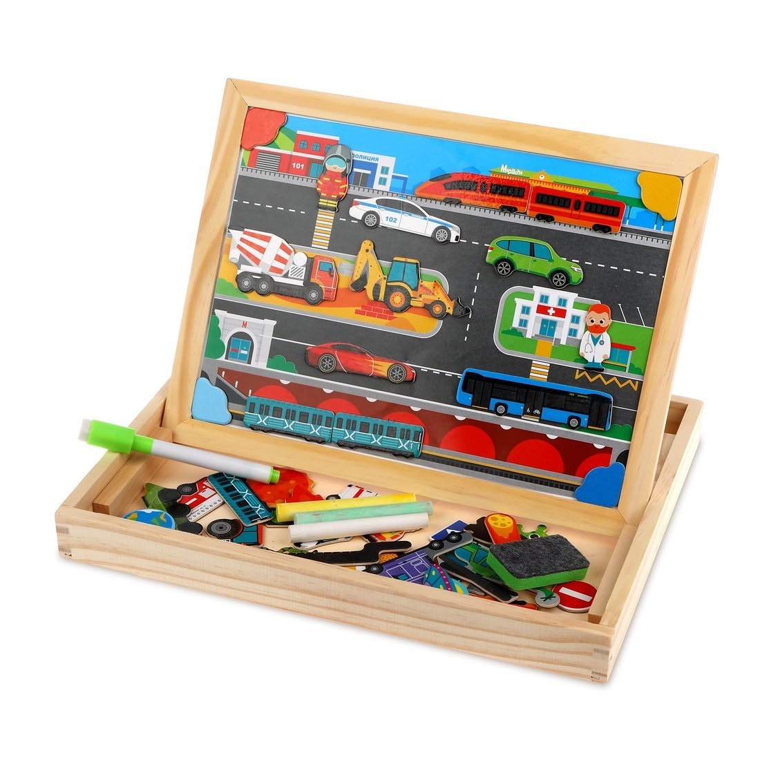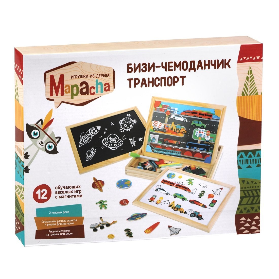 Эксклюзивная разработка ТМ «Mapacha»! В этом чемоданчике 12 обучающих и веселых игр с магнитами. Используя магниты, можно составлять разные сюжеты на заданную тему. Тема этого бизи-чемоданчика — транспорт и профессии, связанные с транспортом. Помимо видов транспорта и представителей профессий в игре есть дополнительные магниты с разными атрибутами, которыми ребенок может заполнять сюжетное пространство. Строгих правил в играх нет, всегда можно отступать от предложенного сюжета, фантазировать и разыгрывать целые спектакли. Благодаря этим играм, родители могут познакомить ребенка с особенностями той или иной профессии,поговорить о правилах дорожного движения и даже поразмышлять об устройстве Вселенной. Малыш может учиться сравнивать предметы по различным признакам, а еще решать простые логические задачки. В набор входит магнитно-маркерная доска. При этом обратная сторона доски — грифельная, на ней можно рисовать настоящими мелками. В дополнение к магнитам в чемоданчике есть два цветных фона. Фоны — это сюжетные декорации к играм. Внутри чемоданчика также есть подробная красочная инструкция, в которой показаны примеры возможных игр. Ну и конечно, родители с ребенком могут придумывать собственные игры с чемоданчиком.