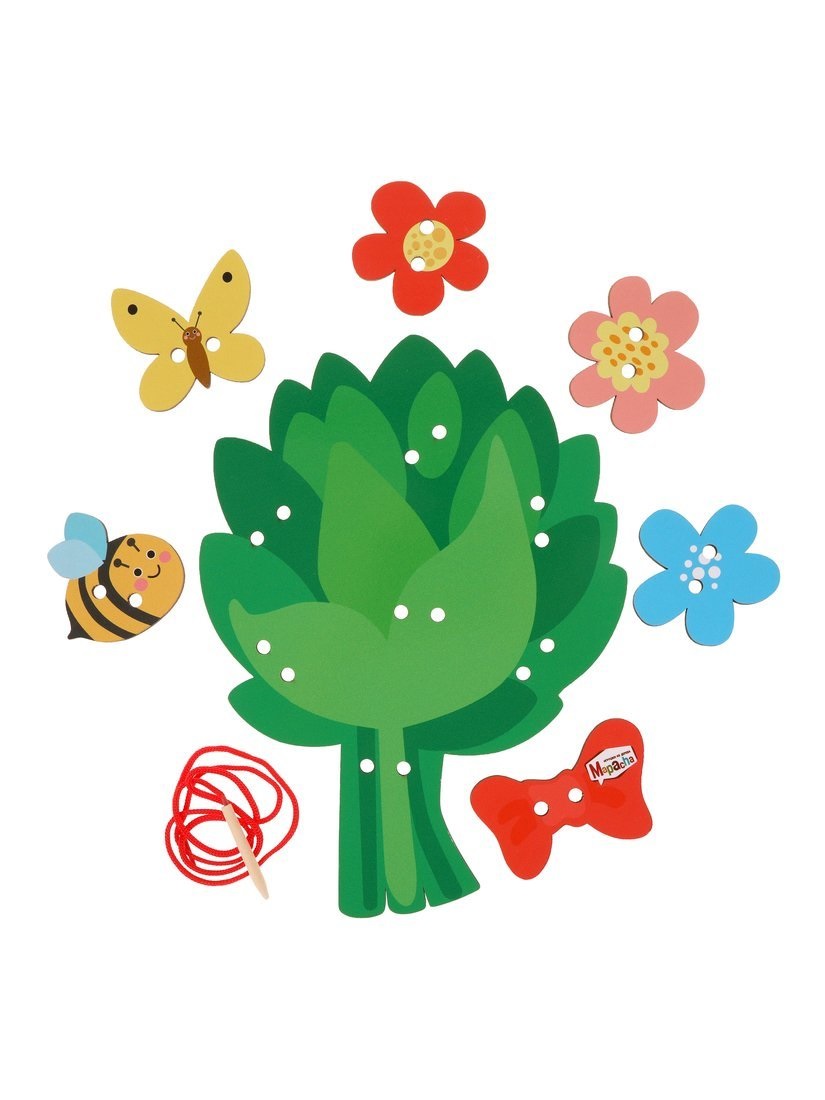 Шнуровка «Букет» станет замечательным подарком для вашего малыша. Задача игры – прикрепить различные детали к основной фигуре, прошнуровав их и закрепив узелками – цветочки, бабочку, пчелку, божью коровку и бантик. Шнурок с удобным наконечником поможет крохе справиться с этой интересной задачей.