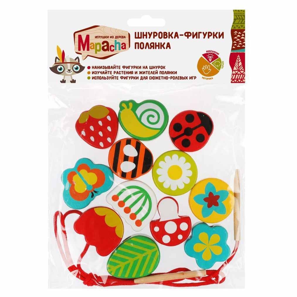 Шнуровка Фигурки Полянка 12 деталей, 3-4 см, шнурок, фирмы Mapacha (Мапача), для малышей. Простая, но интересная игра, которая обязательно увлечёт малыша! Цель игры: нанизывать на шнурок все разноцветные бусинки. Ребёнку будет очень интересно менять последовательность фигурок и нанизывать их снова и снова! К обоим концам шнурка прикреплены удобные деревянные "иголки", с помощью которых можно легко продеть шнурок в отверстие бусины. Игра поспособствует развитию у малыша мелкой моторики рук, тактильных ощущений, способности концентрировать внимание, усидчивости и мышления.