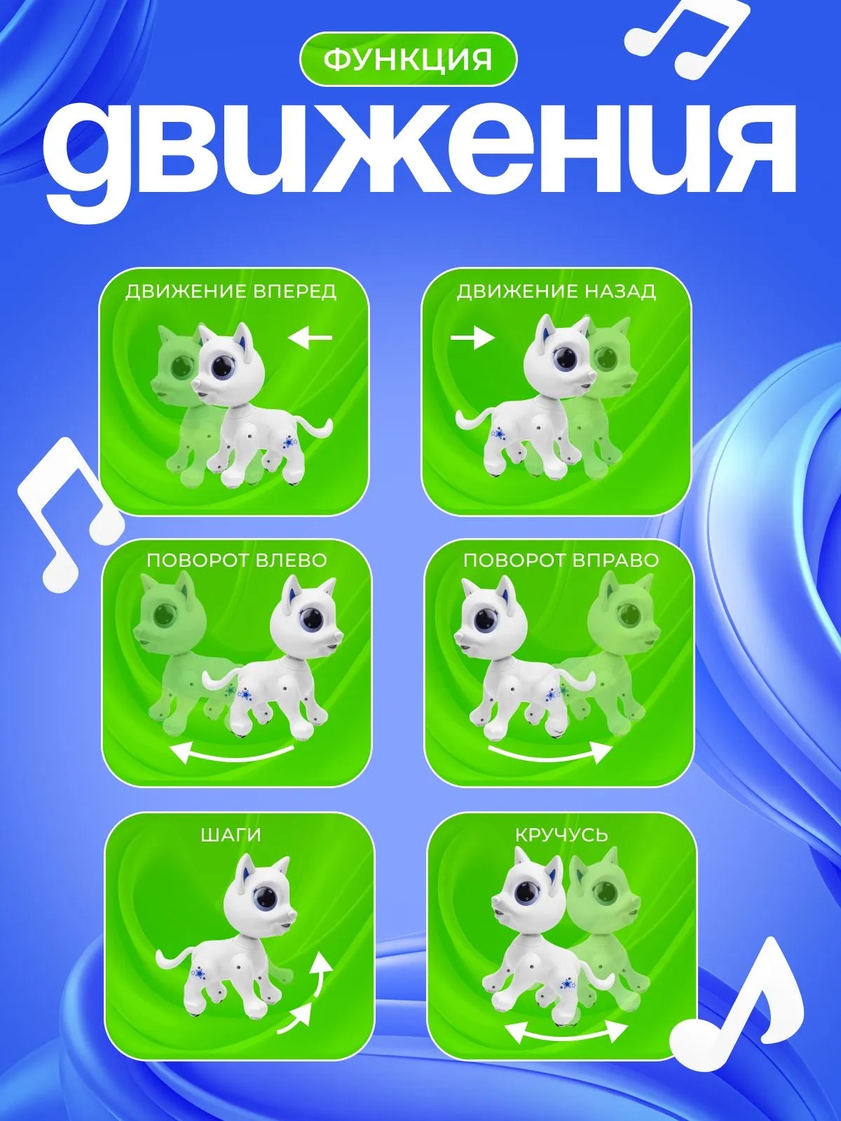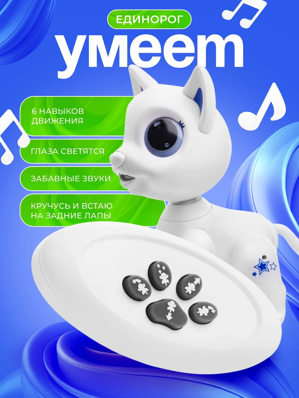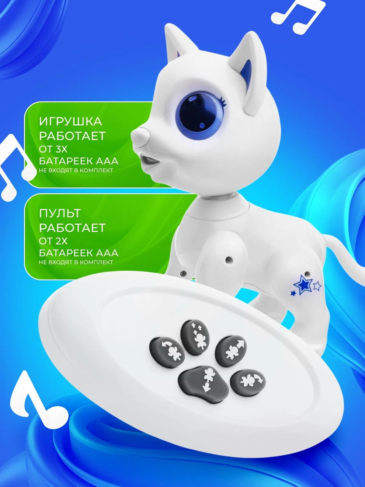 • Игрушка работает от 3-х батареек ААА (не входят в комплект)• Пульт управления работает от 2-х батареек ААА (не входят в комплект)• Функции:- включение и выключение 3-х секундным нажатием на нос.- перемещение при помощи колёс на задних лапах.- движение вперёд, назад.- повороты влево, вправо.- шагание вперёд.- вращение на 360 градусов.- светятся глаза.- голова поворачивается вручную.• Размеры игрушки: 20х13х22 см.• Материал: пластик.• Соответствует требованиям безопасности продукции.• Для детей от 3-х лет.