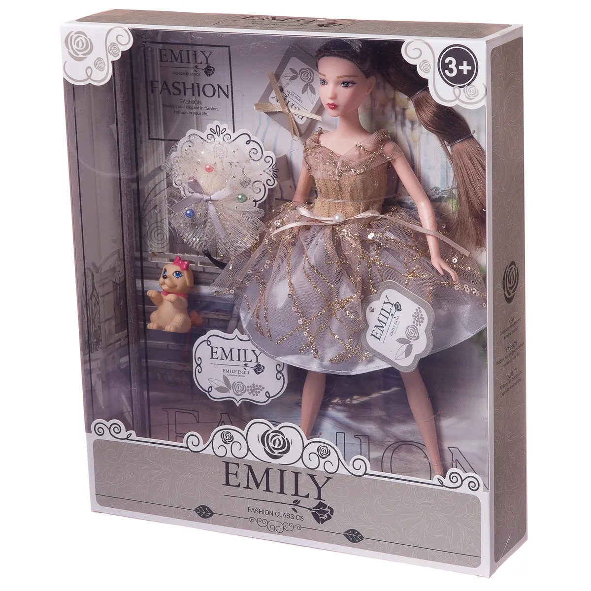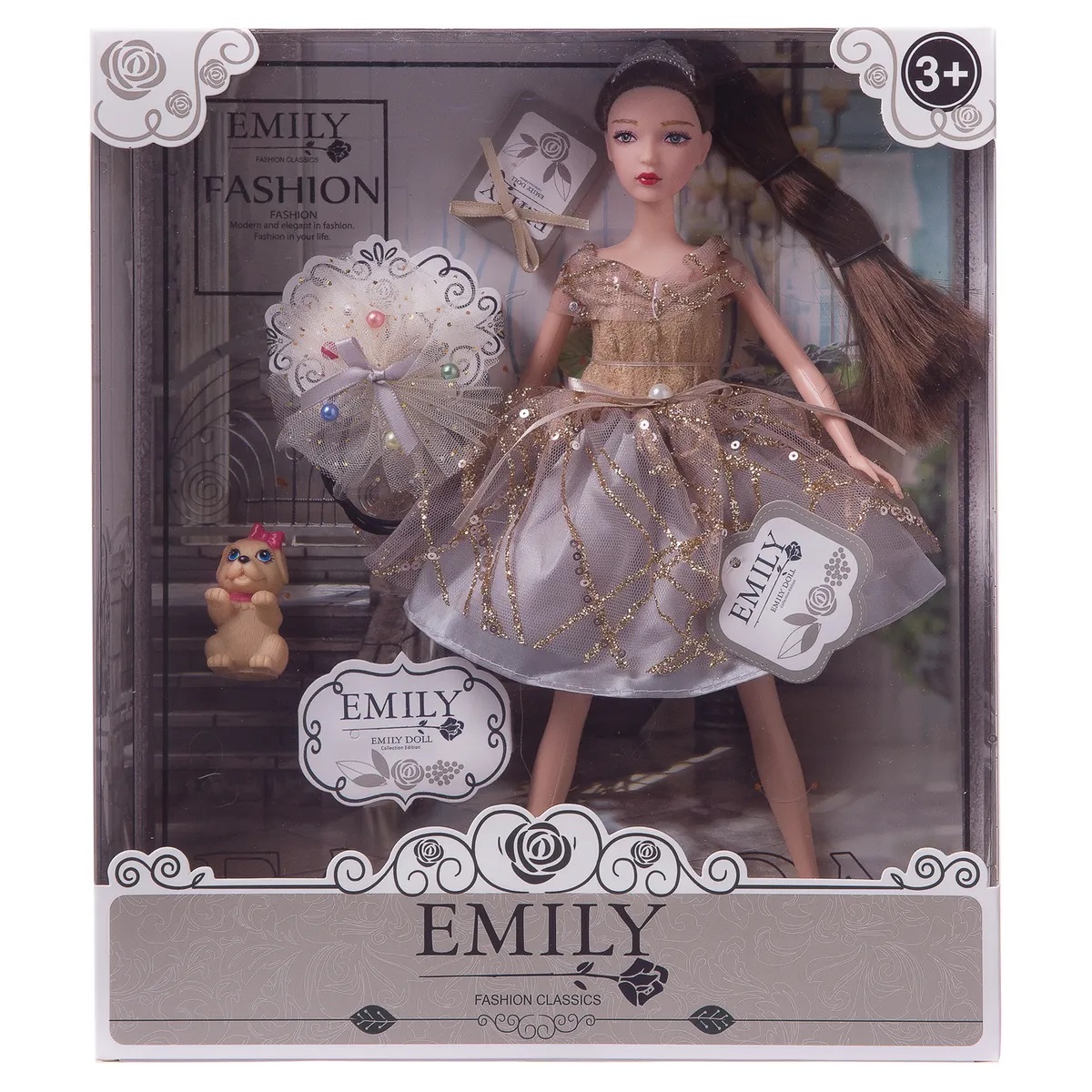 Кукла Эмили выглядит как красивая молодая девушка, которая разбирается в новинках моды и любит следить за собой. Ребенок, играя с такой куклой, придумает разные сюжеты, в которых он использует все наряды для игрушечной подружки. Также в наборе имеются модные аксессуары. У куклы подвижны части тела, благодаря чему в процессе игры девочка сможет менять положение игрушки. Комплектность: кукла, фигурка собачки, аксессуары. Материалы: полимерные материалы, текстиль. Упаковка: коробка с окошком.