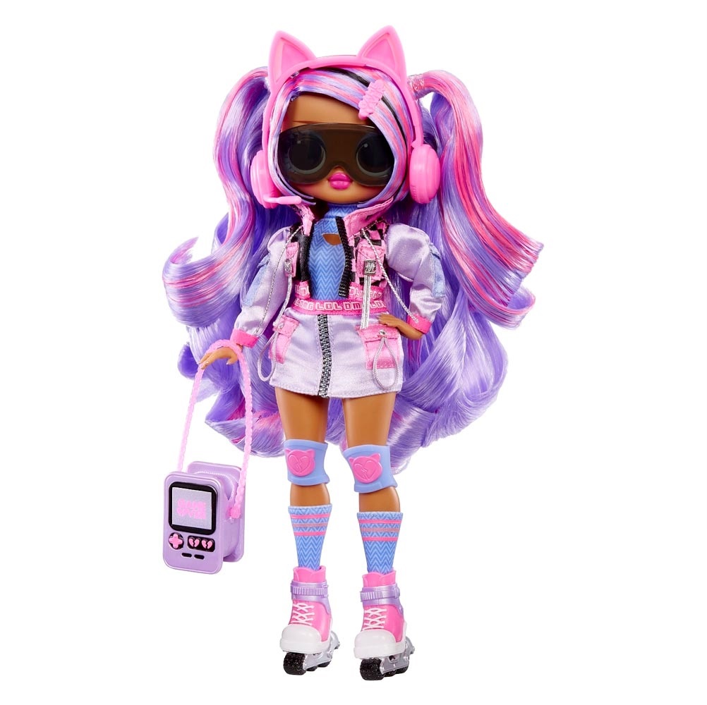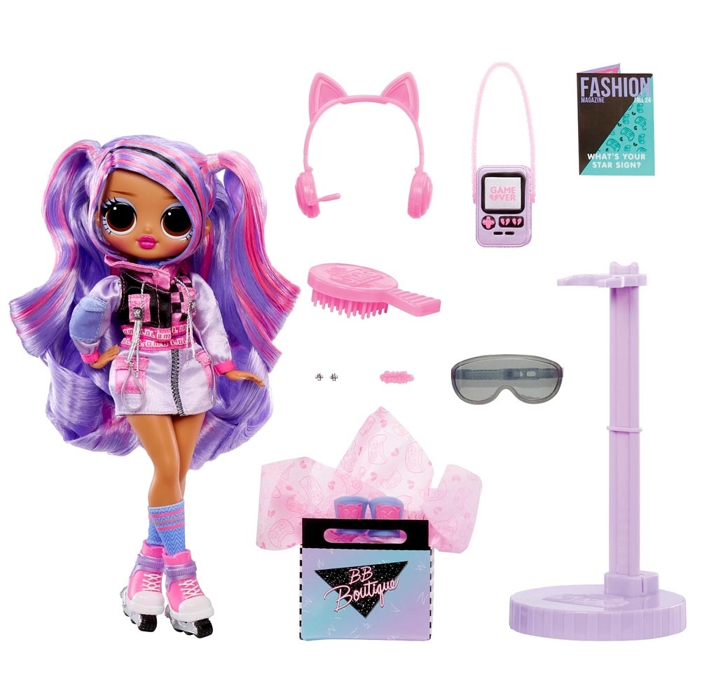 В игровом наборе ЛОЛ СЮРПРАЙЗ ОМГ Эйс кукла с длинными густыми прошитыми волосами, подвижными ручками и ножками, включая локтевые и кистевые суставы (9 точек артикуляции), комплект одежды, ролики, модные аксессуары, расческа для куклы, подставка.