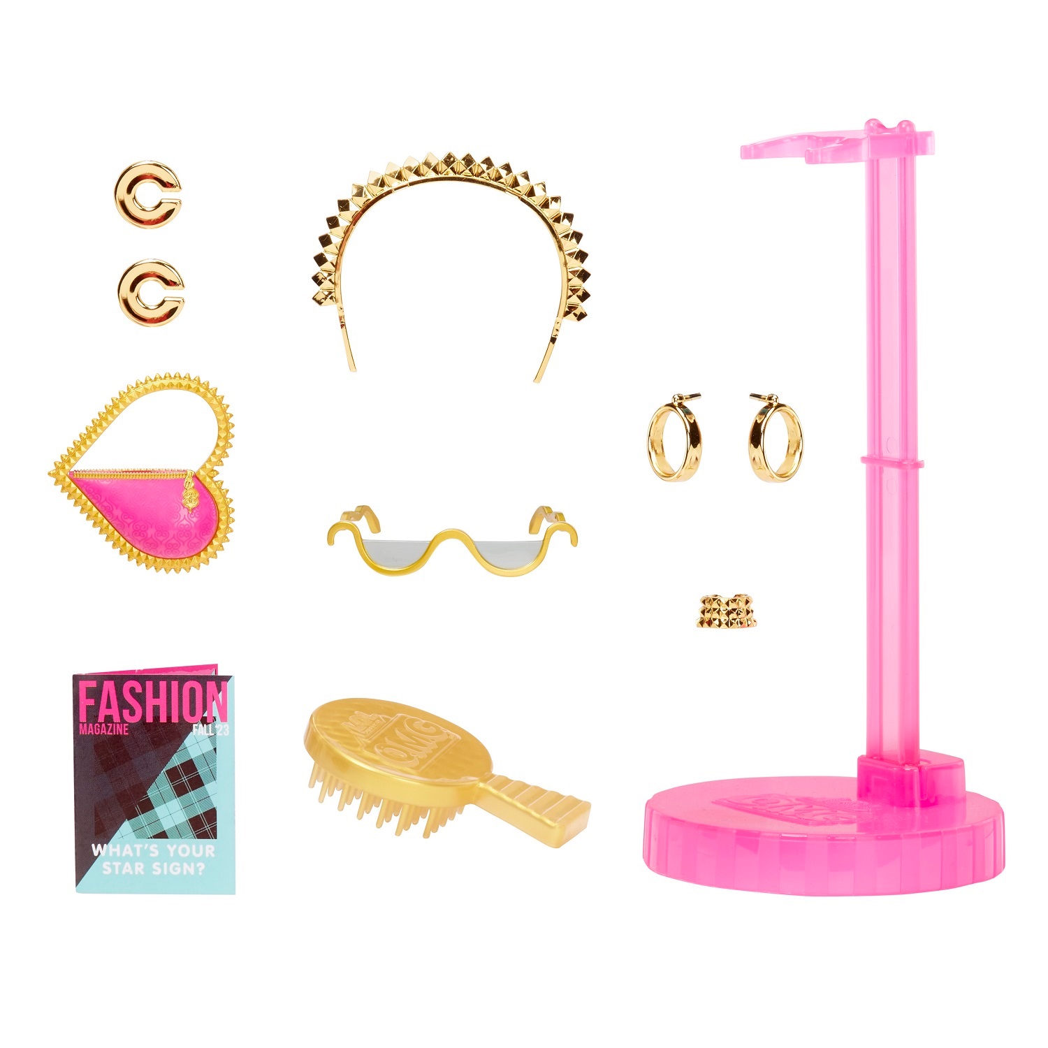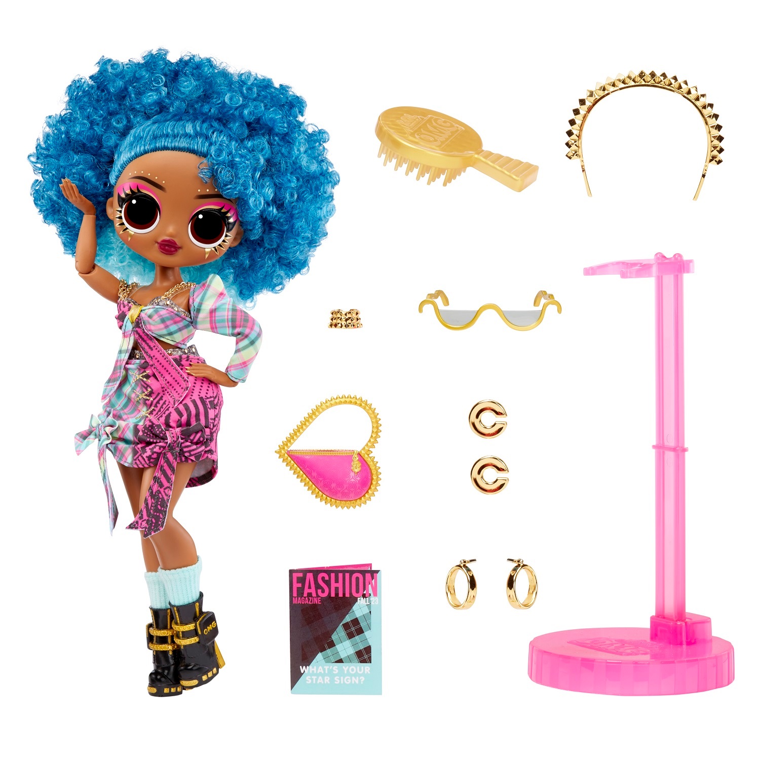 В игровом наборе модная кукла ЛОЛ ОМГ Джемс высотой 25 см с длинными прошитыми волосами и подвижными ручками и ножками; комплект одежды и обуви, серьги, сумочка, очки, браслеты, ободок, расческа, журнал, подставка для куклы. Товар сертифицирован и безопасен для детского использования.