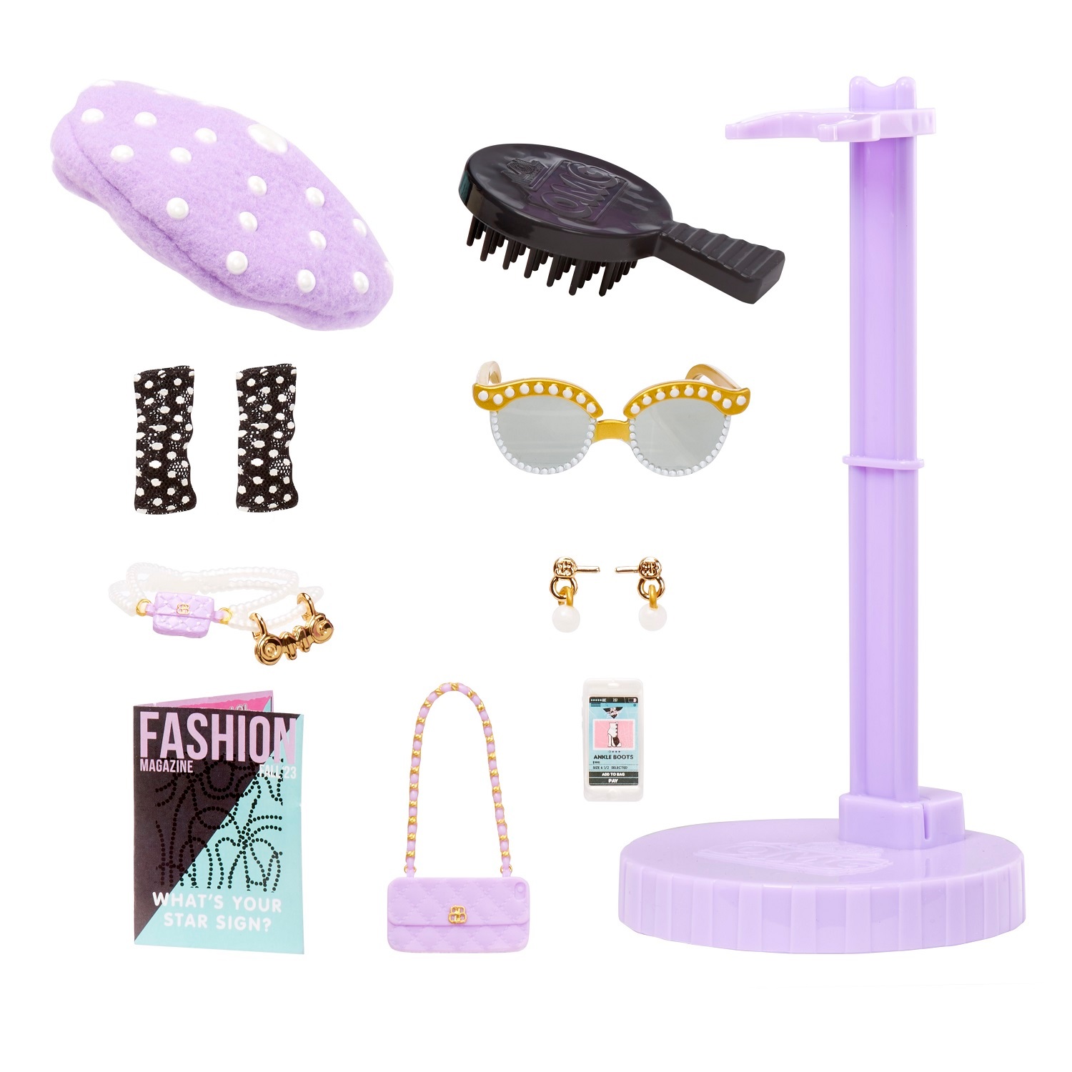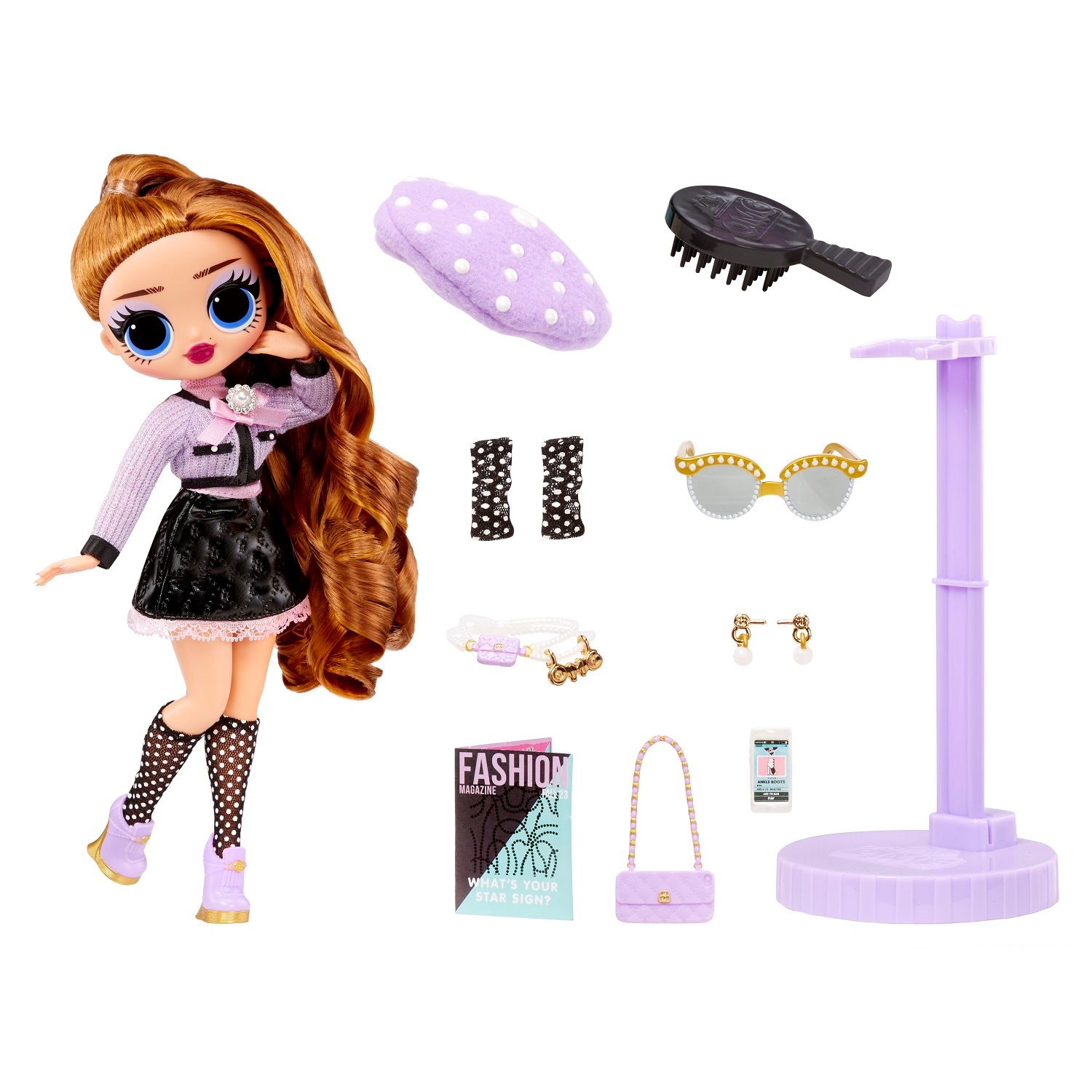 В игровом наборе модная кукла ЛОЛ ОМГ Пози высотой 25 см с длинными прошитыми волосами и подвижными ручками и ножками; комплект одежды и обуви, серьги, сумочка, очки, берет, пояс, расческа, митенки, журнал, подставка для куклы. Товар сертифицирован и безопасен для детского использования.