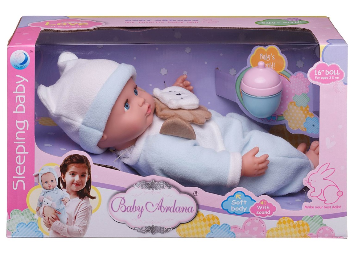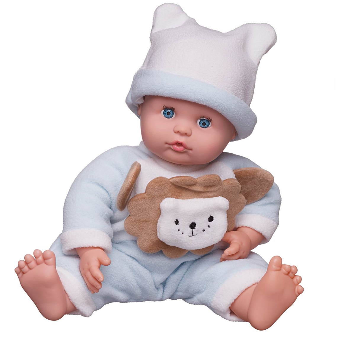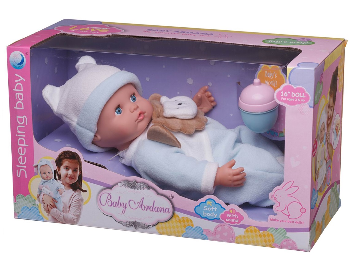 Эта очаровательная куколка-пупс будет отличным подарком для любой девочки. Она выглядит как настоящий малыш, имеет мягкое тело, ее так приятно прижимать к себе. Кукла-пупс одета в голубой комбинезон, украшенный объемной аппликацией в форме «Львенка», мягкую шапочку. У нее есть бутылочка. Кукла-пупс упакована в подарочную красивую коробку. Глазки у куклы не закрываются.