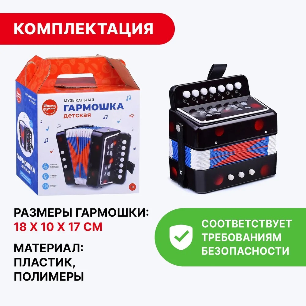 Гармошка детская: музыкальная игрушка, которая развивает и вдохновляет! Эта миниатюрная копия настоящего музыкального инструмента создана специально для малышей. Она не только забавляет, но и помогает развивать музыкальный слух, координацию движений и мелкую моторику. Почему стоит выбрать нашу гармошку? Компактный размер: легко помещается в маленькие ручки, идеально подходит для малышей. Размеры гармошки: 18 х 10 х 17 см. Простота в использовании: яркие кнопки и интуитивно понятное управление делают гармошку доступной даже для самых маленьких. Долговечность: изготовлена из прочной пластмассы и полимерных материалов, которые выдерживают активное использование. Музыкальное развитие: гармошка поможет вашему ребенку развить чувство ритма, слух и творческие способности. Подарите своему малышу радость от первых музыкальных открытий!