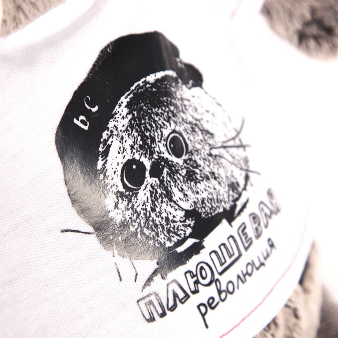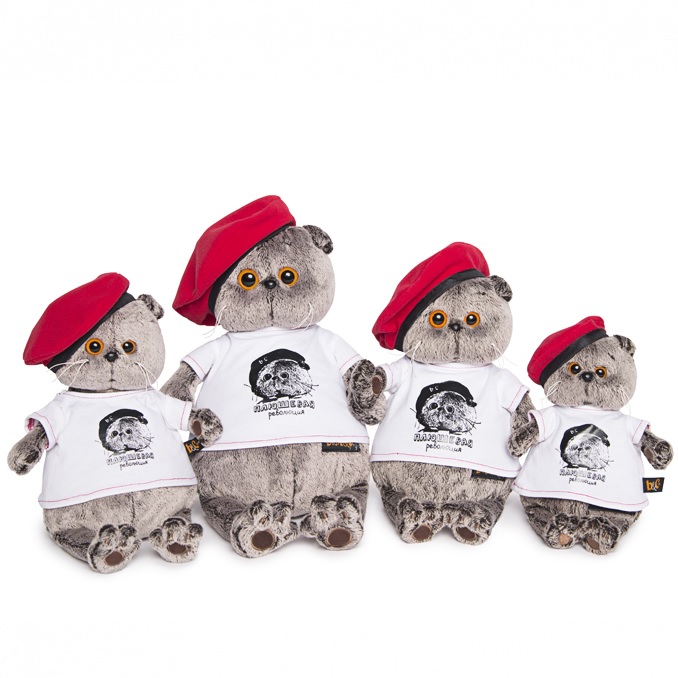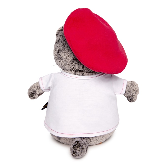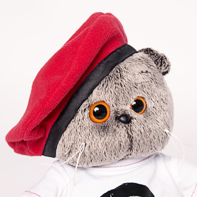 Кот в необычном, революционном комплекте. На Басике белоснежная футболка с оригинальным принтом и красной отстрочкой. Также в комплекте - алый флисовый берет на чёрном ободке. Ks25-074