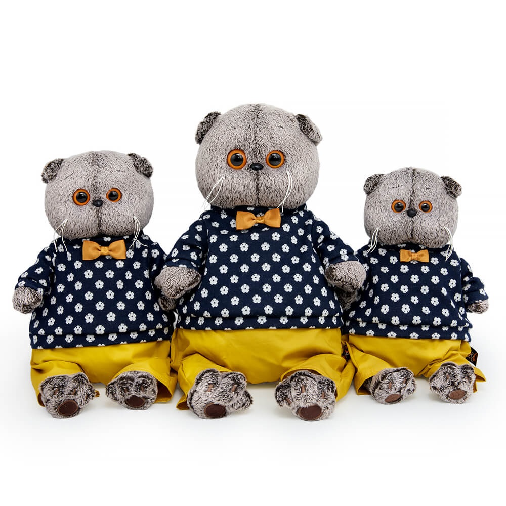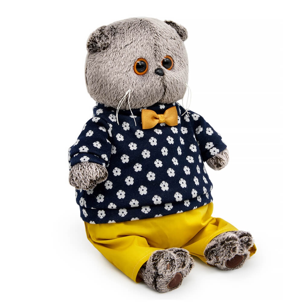 Басик в шикарном джемпере из чёрного жаккардового трикотажа в белый цветочек. Широкие штанишки цвета светлой горчицы очень эффектно дополняют джемпер. На шее Басика небольшой атласный бантик цвета античного золота