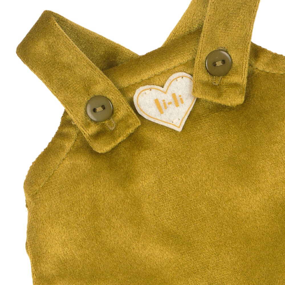 Шикарный комбинезон из оливкового бархата, сшит с лямочками на пуговках. Спереди украшен нашивкой в виде сердечка с именем кошечки Ли?Ли. В комплекте длинный шарфик из мягкого вельвета пурпурного цвета.