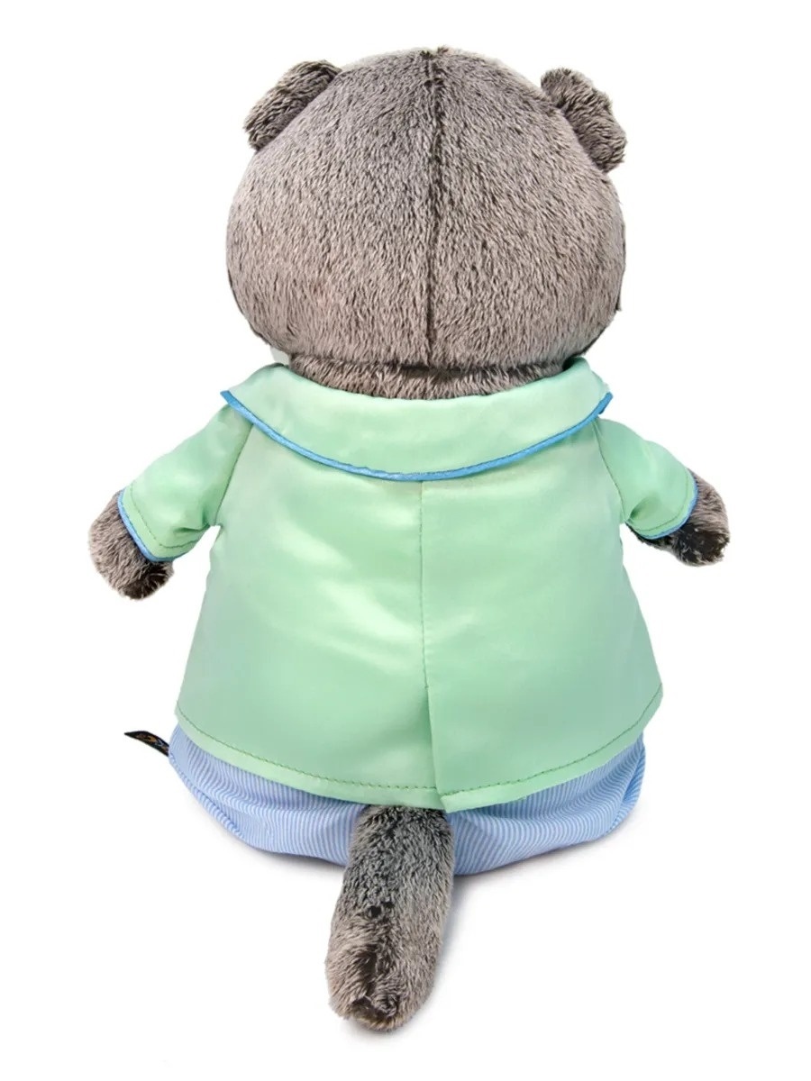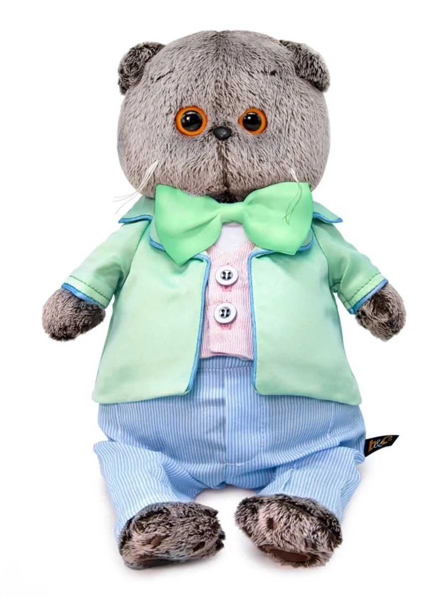 Кот Басик от БУДИ БАСА в невероятно модном и дорогом комплекте в пастельных тонах. Пиджак из плотного х/б сатина мятного цвета с голубым кантом. Жилет цвета розовой воды с люрексом на серебристых пуговках. Элегантные х/б брючки в бело-голубую полоску. Белая футболочка из х/б трикотажа. Также в комплекте объемный галстук-бабочка. Одежду и аксессуары можно снимать. Продается в стильной подарочной коробке с атласными лентами, собранными в нарядный бант. Лучший подарок для тех, кто любит котиков и не готов с ними расставаться. Игрушка поставляется в фирменном коробе, защищающем подарочную упаковку. Гарантируем оригинальность продукта, его высокое качество и привлекательную цену благодаря эксклюзивному договору с производителем и отгрузке напрямую со склада. Шотландский вислоухий кот Басик с мягкой плюшевой шерсткой серебристо-лилового цвета, выразительными медовыми глазами и коротким хвостиком.