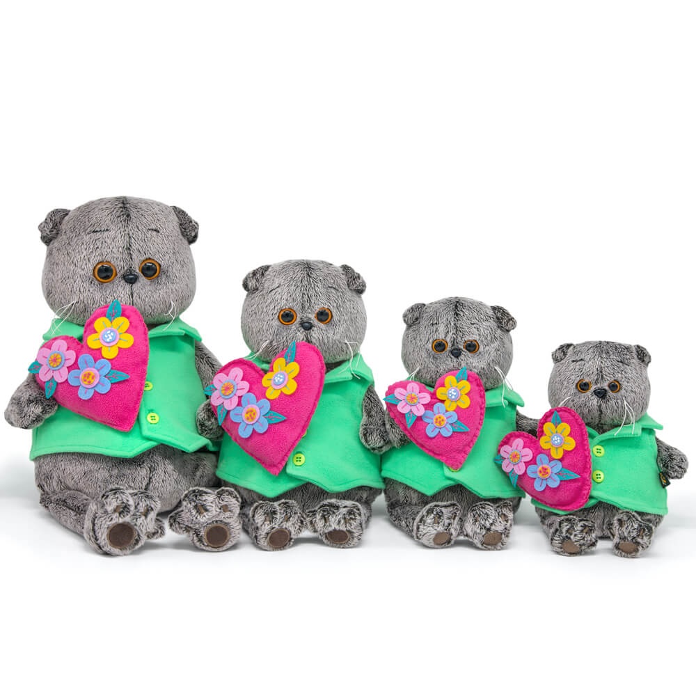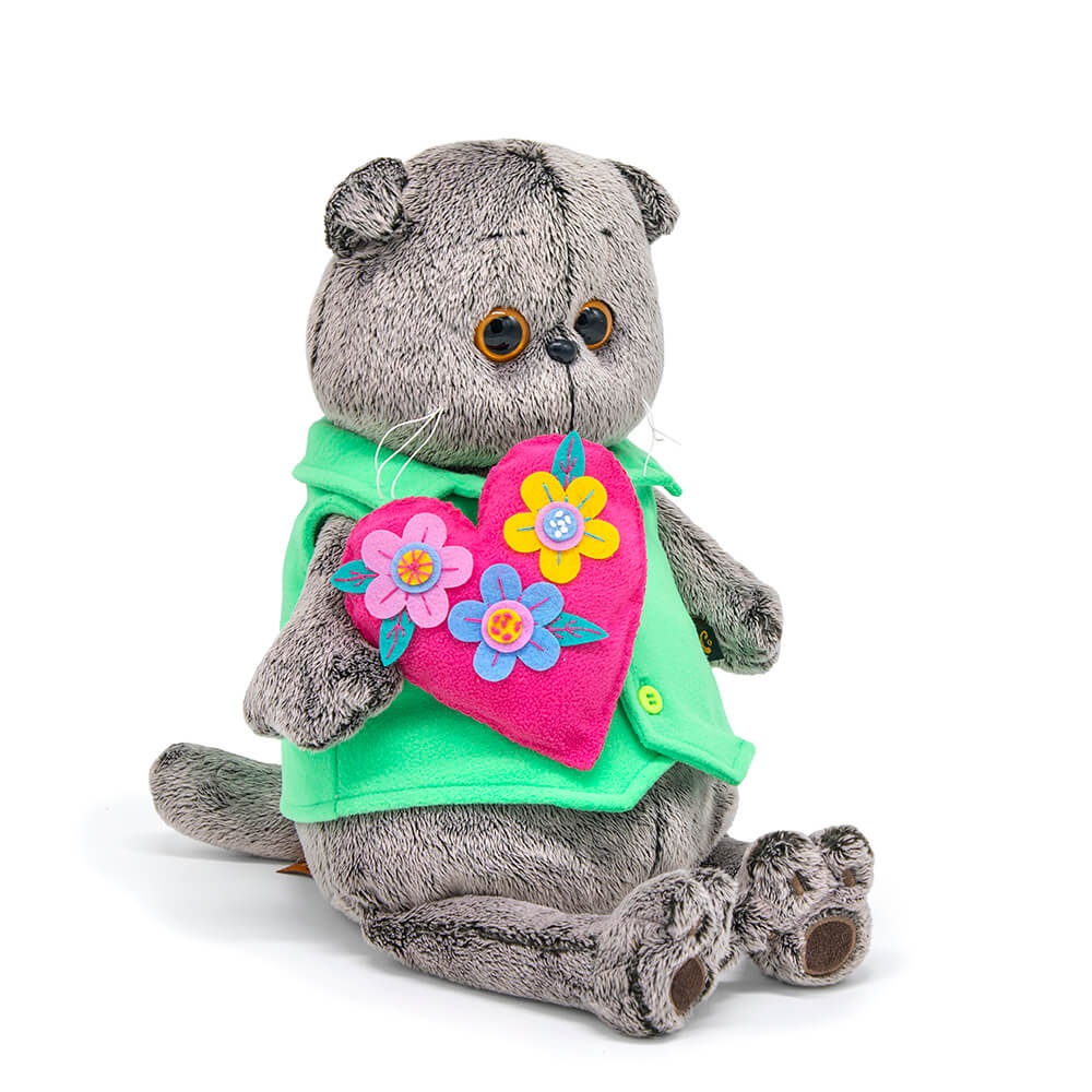 Кот в мягком жилете из флиса цвета весеннего бутона, в лапках держит оригинальное розовое сердечко из флиса ручной работы. Сердечко украшено крупными цветами из фетра различных оттенков.
