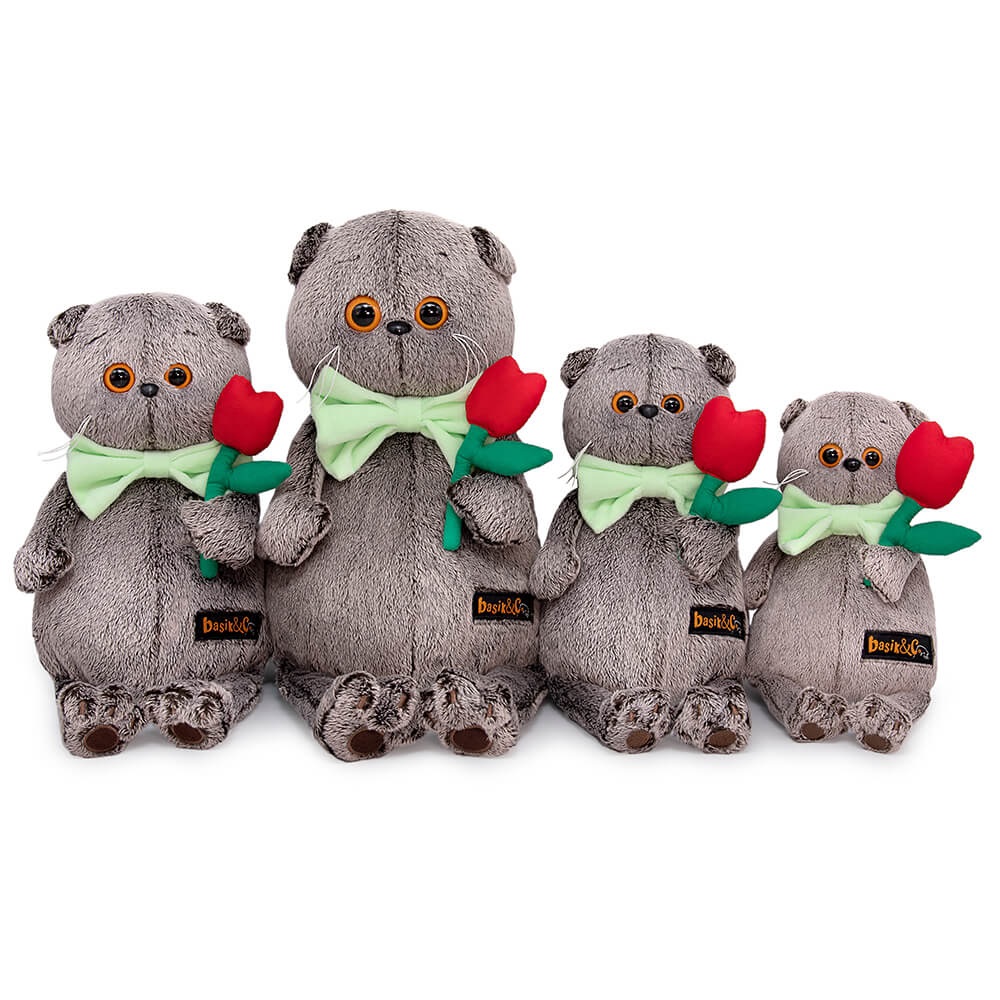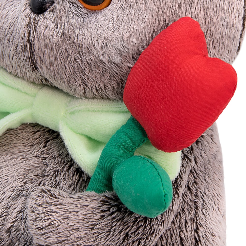 Басик готов подарить вам большой красный тюльпан. Тюльпан выполнен вручную из алой и изумрудной ткани. Также Басика украшает объемный галстук?бабочка нежно?мятного цвета.