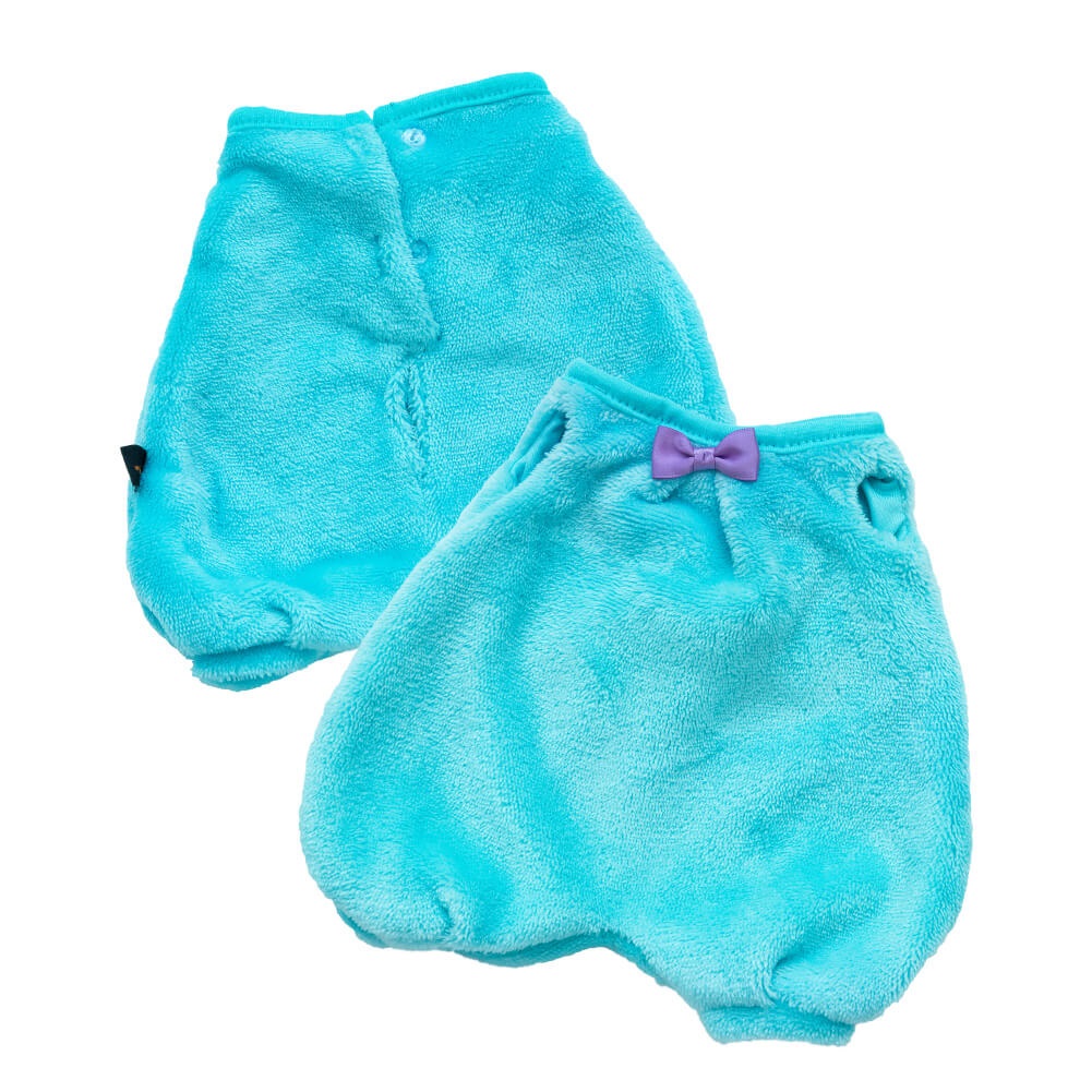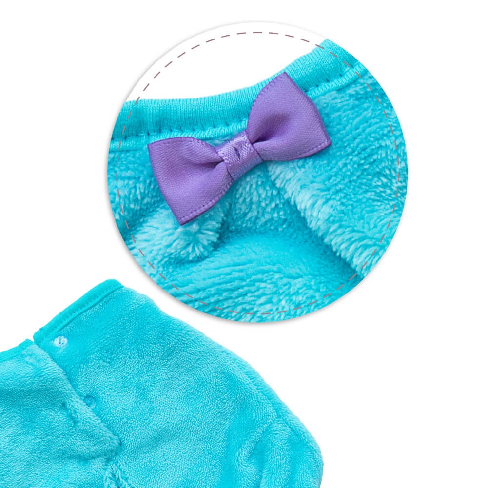 Уютный, объемный комбинезон из нежнейшего софта эфирного голубого цвета. В комплекте небольшой галстук?бабочка из атласной ленты цвета шелковицы.