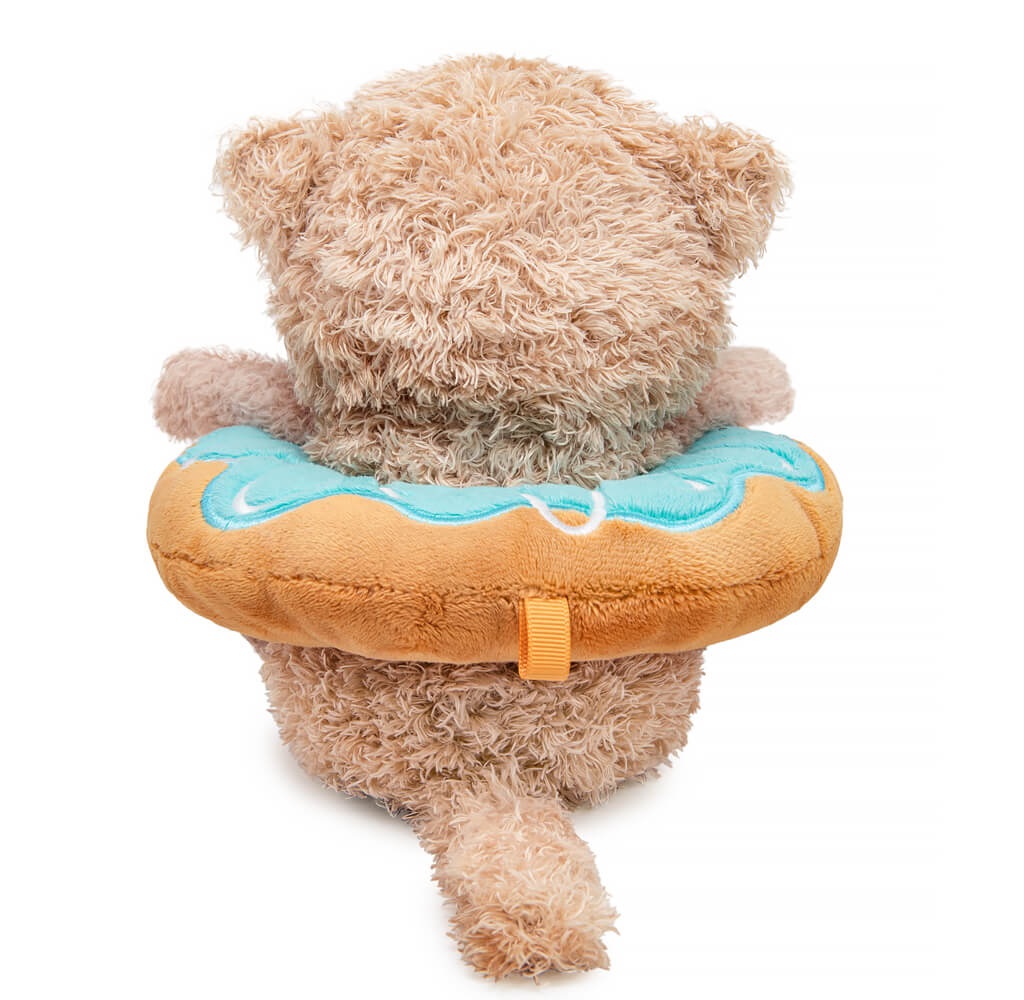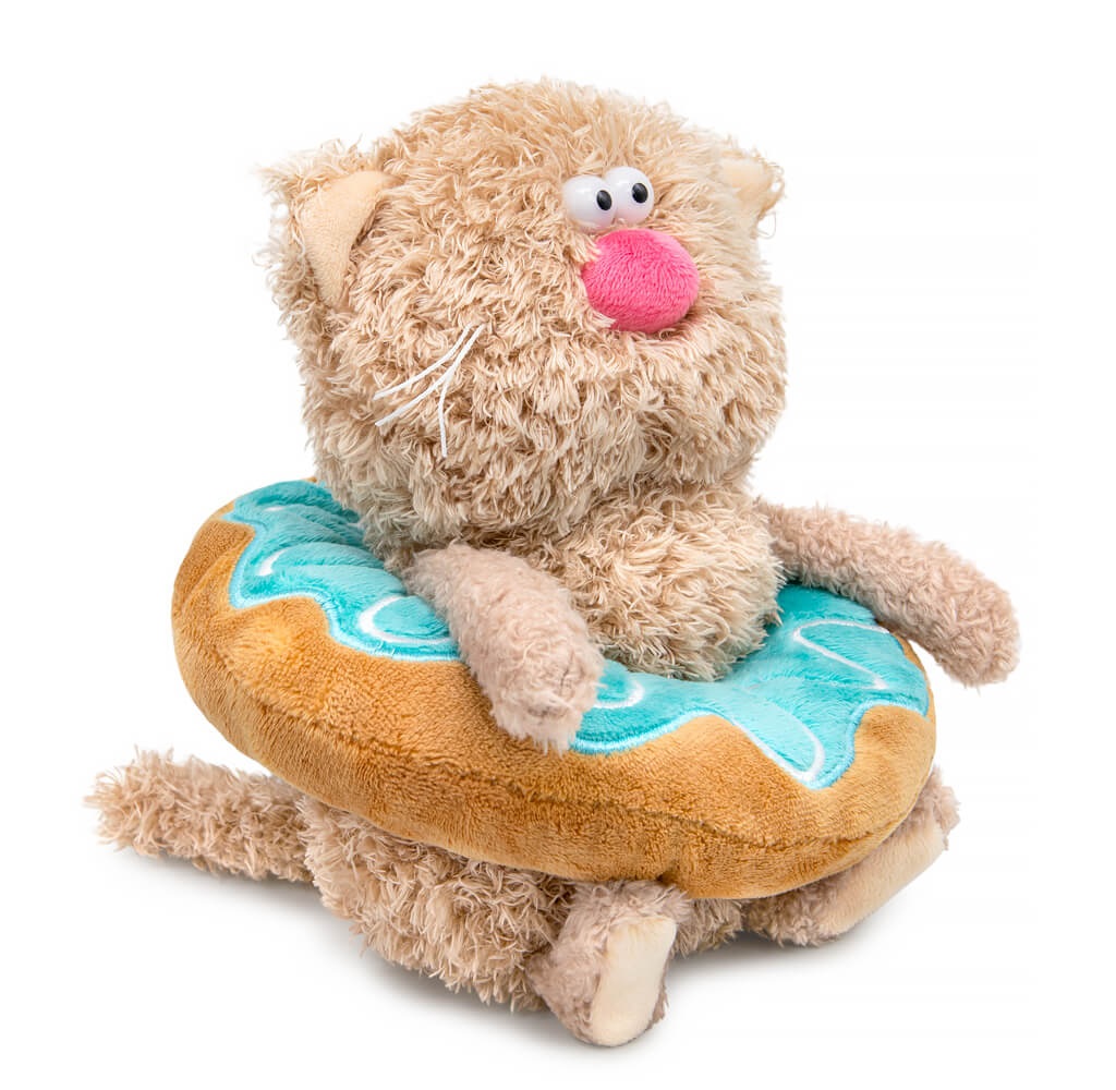 Очаровательный котик Какао из тактильно приятного эко меха цвета какао с молоком. Котик уютно расположился в милом пончике, который сшит из карамельного и голубовато-бирюзового софта. Пончик украшен вышивкой и имеет петельку для того, чтобы его можно было использовать в качестве подвеса.