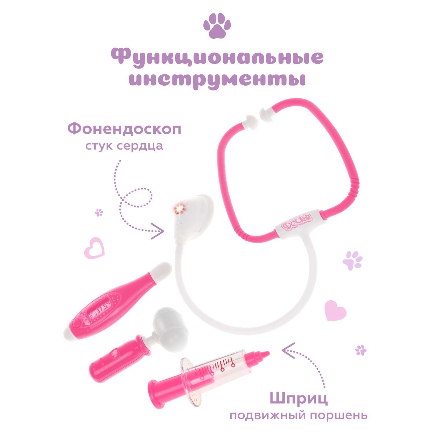 - В комплекте: сумка-переноска, мягкая игрушка (котенок), фонендоскоп, термометр, молоточек и шприц (муляжи)