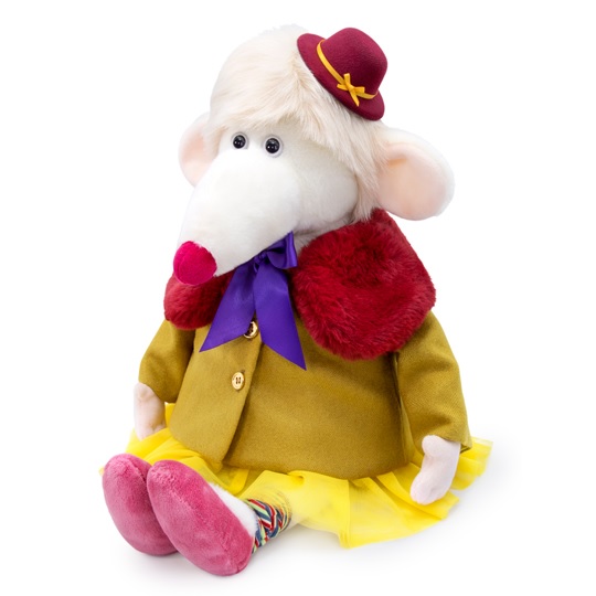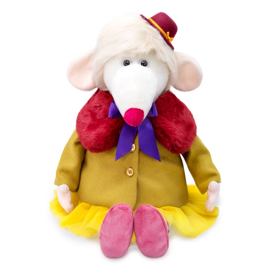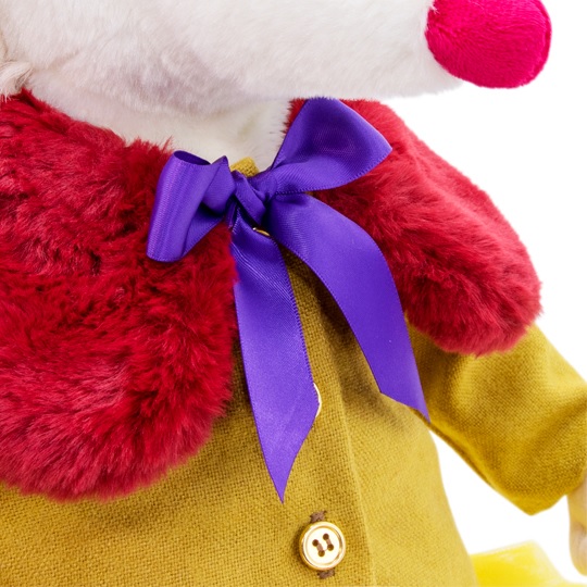 На Барбаре шикарное пальто из ткани цвета оливкового масла с застёжкой на золотые пуговицы. Пальто сшито с объёмным меховым воротником цвета бургундия, спереди пальто украшено бантом из широкой атласной ленты цвета королевской сирени. Также в комплекте пышная юбочка из сеточки ярко-жёлтого цвета и маленькая бордовая шляпка с жёлтой ленточкой и бантиком.