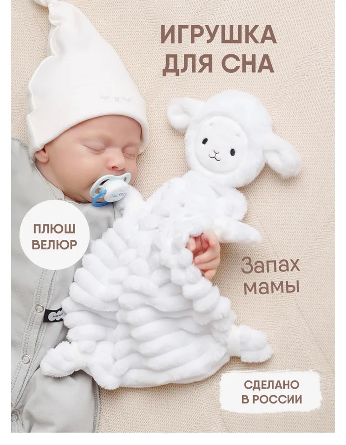 Игрушка для сна новорожденных Овечка Белла — это первая и самая важная игрушка для малыша. Созданная для самых сладких и крепких снов младенца, ванильная овечка выполнена из мягчайшего материала, который не раздражает нежную кожу новорожденного. Взаимодействуя с мягким материалом комфортера, ребенок осваивает важнейшие навыки самоуспокоения и учится засыпать самостоятельно. Теперь не придется считать овец для засыпания – нужна всего одна! Милая мордочка вызовет интерес у детей. Мама может придумать сказку или просто рассказать ребенку, как разговаривает овца, где у нее ушки, лапки, глазки, носик, ротик. А во время бодрствования комфортер отлично подойдет для активных игр – его приятная фактура ткани и вышивки поможет в развитии тактильного интеллекта и мелкой моторики. С одной стороны у комфортера фактурный мех, а с другой - гладкий, что развивает тактильное восприятие. Использовать плюшевую зверушку для новорожденных легко — ее следует носить ближе к телу и прикладывать во время кормления и укачивания. Также можно класть в кроватку, коляску или автокресло. Мягкая ткань впитает родной запах мамы, и младенец всегда будет ощущать ее присутствие. Знакомая и любимая с первых дней жизни игрушка позволит малышу успокоиться в незнакомых ситуациях — на приеме у врача, в гостях или в магазине. Внимательный подход к первой игрушке сделает ее самой значимой для ребенка на несколько первых и самых важных лет жизни и обеспечит комфортный сон маме и малышу. Стильный дизайн в актуальных пастельных нейтральных тонах придется по душе современным и динамичным мамам. Нежная и функциональная игрушка-антистресс выполнена из гипоаллергенных премиальных материалов, которые безопасны для новорожденных. Бэлла легко стирается при 30 градусах и сохраняет цвет и форму даже после многократных стирок. Очень важно, что по мере взросления ребенка, сплюшка сможет стать просто любимой игрушкой-талисманом. Будет замечательным подарком на любой праздник и как сюрприз в обычный день.