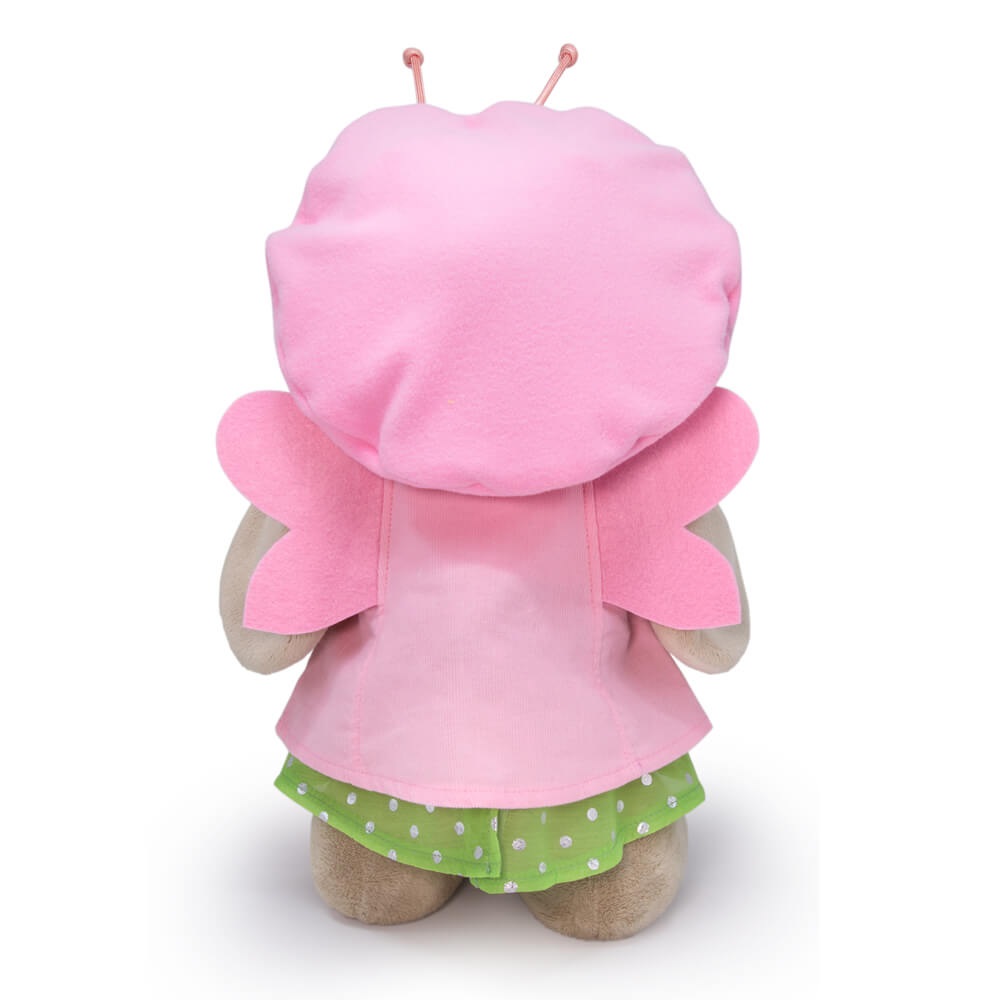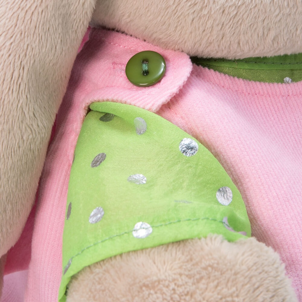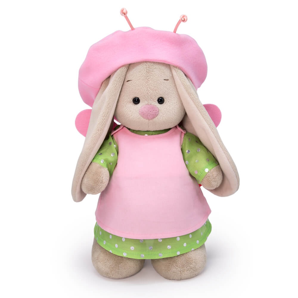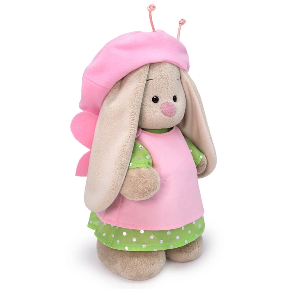 Зайка Ми в очаровательном костюме «Бабочка». Нежно?зеленое х/б платьице в серебристый горошек, поверх платья х/б сарафанчик цвета розовой карамели со вшитыми розовыми крылышками из фетра. Также в комплекте мягкий розовый беретик с усиками из шелковистого шнурочка.