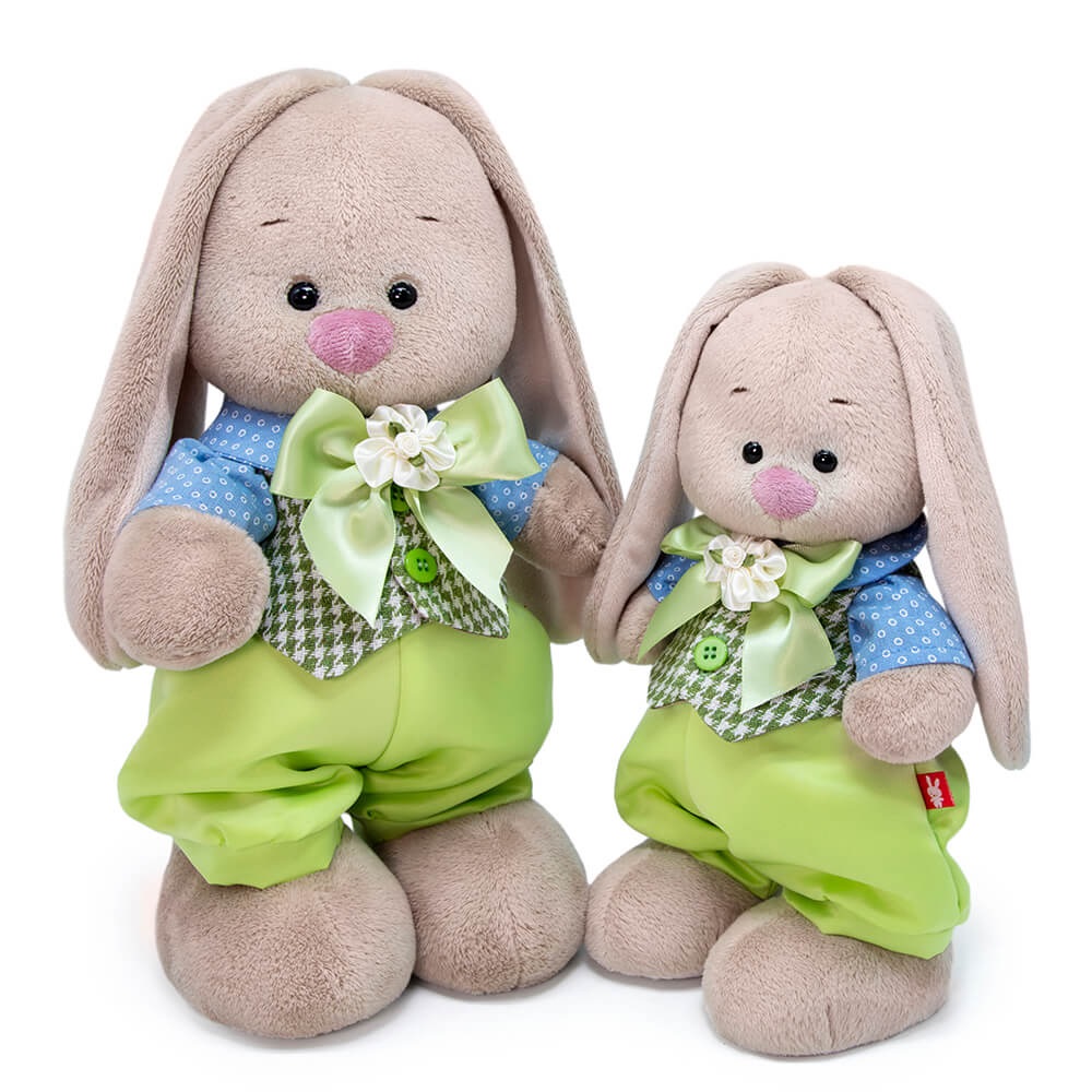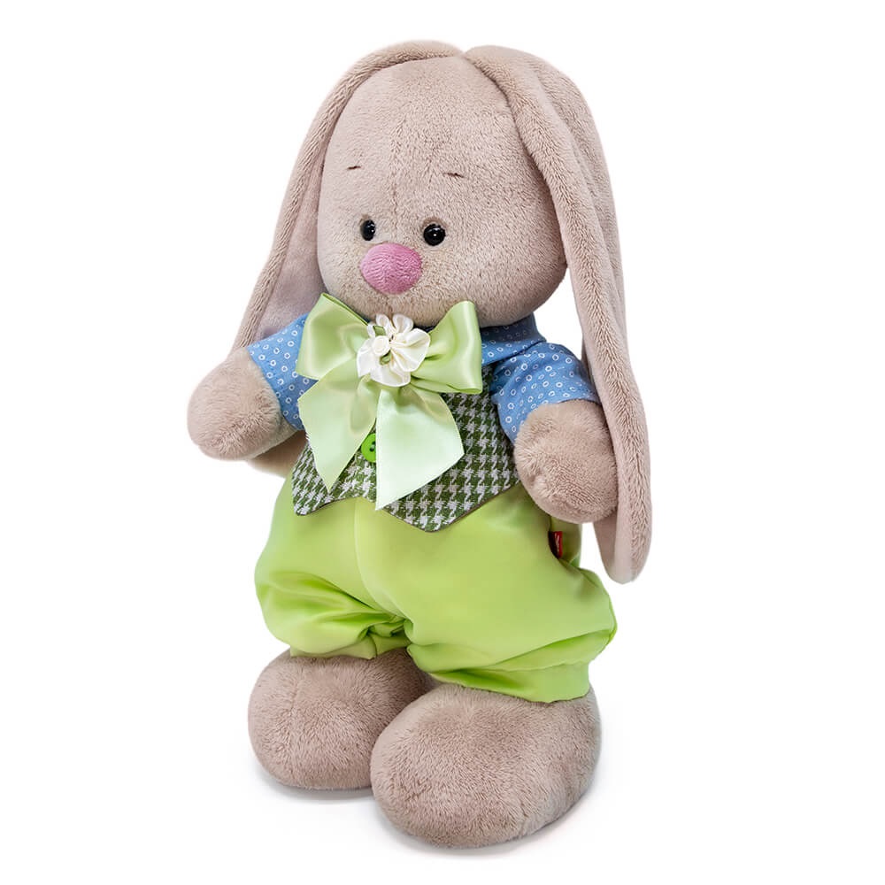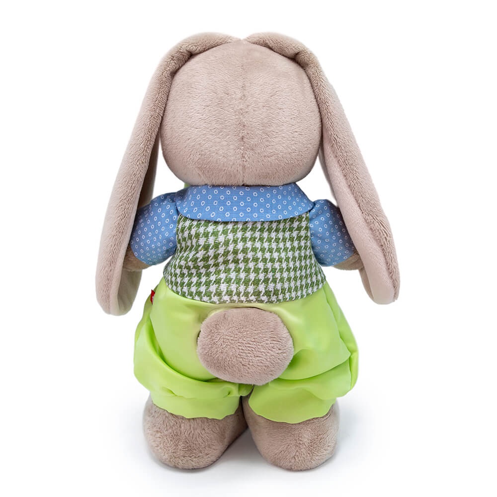 Зайка в шикарном праздничном комплекте. Широкие штанишки цвета сочного салата, небесно?голубая хлопковая рубашечка и жилет из твида с зеленым узором пастушья клетка (shepherd’s check). Также в комплекте объемный бант, собранный вручную из широкой атласной ленты и белого цветочка с розочкой в серединке.