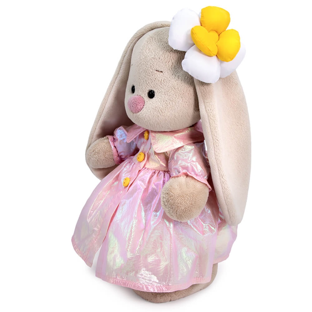 На Зайке супермодный плащик из лазерной блестящей ткани в розово?золотистых оттенках. Плащ сшит отрезным по талии, с отложным воротничком и пышными рукавчиками на резинке. На ушке у Зайки необычный аксессуар из болоньевой ткани — объемный бело?желтый цветок, мягкие лепестки которого набиты синтепоном.