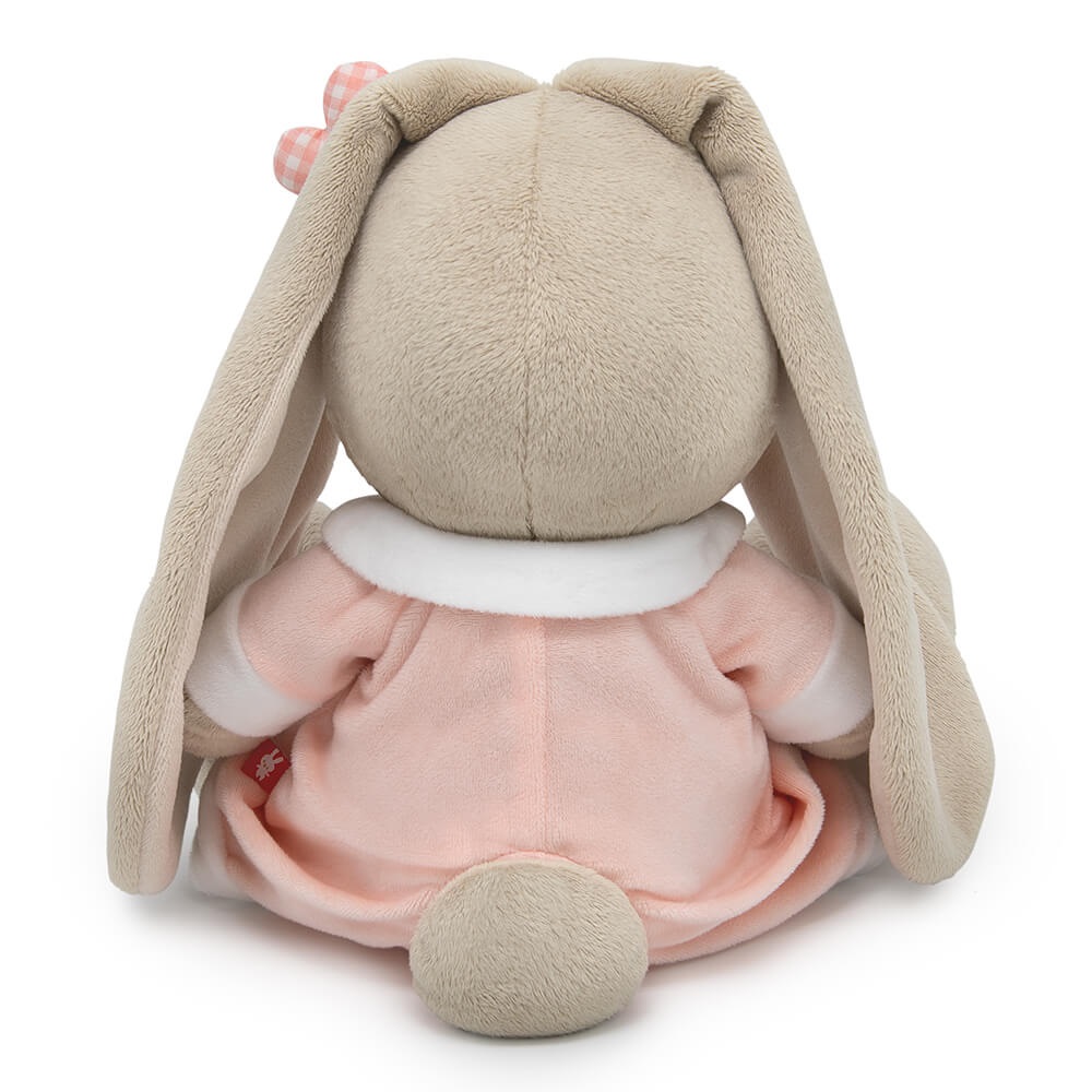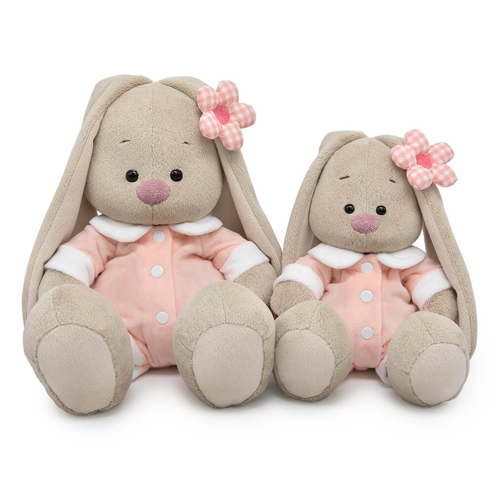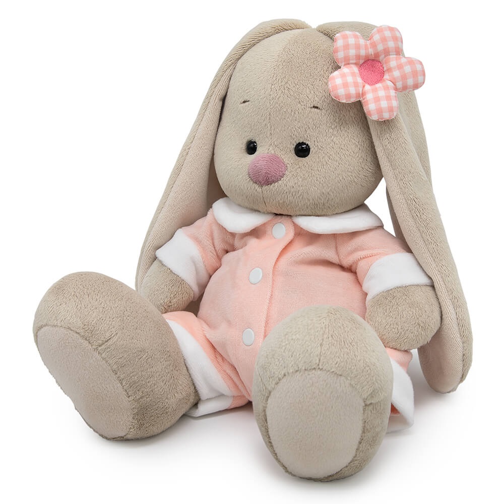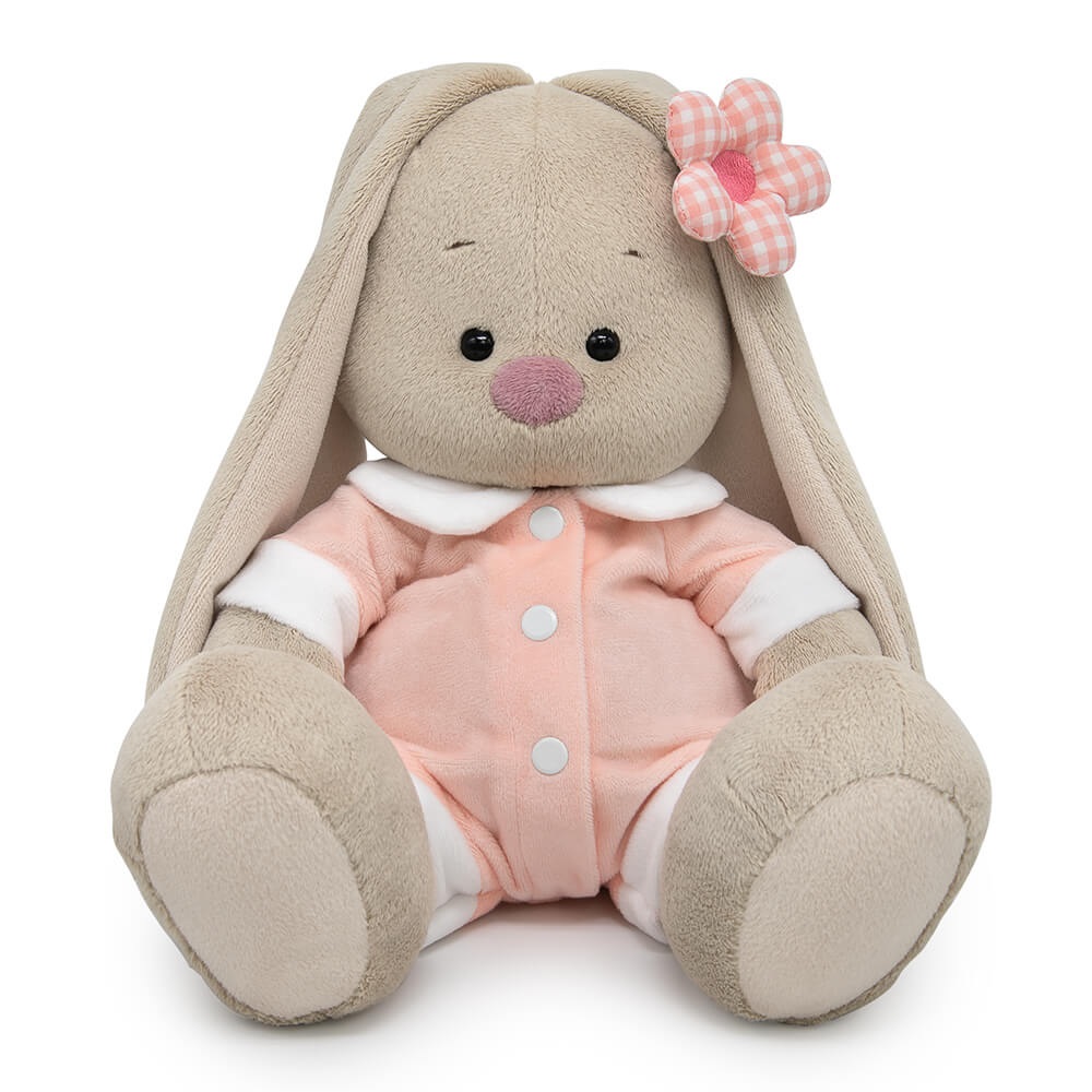 Зайка Ми в невероятно мягком комбинезоне из софта пудрового цвета с белым воротничком и белыми отворотами, спереди с застежкой на белые кнопки. На ушке у Зайки классный аксессуар — объемный цветочек из клетчатой ткани в тон комбинезона.