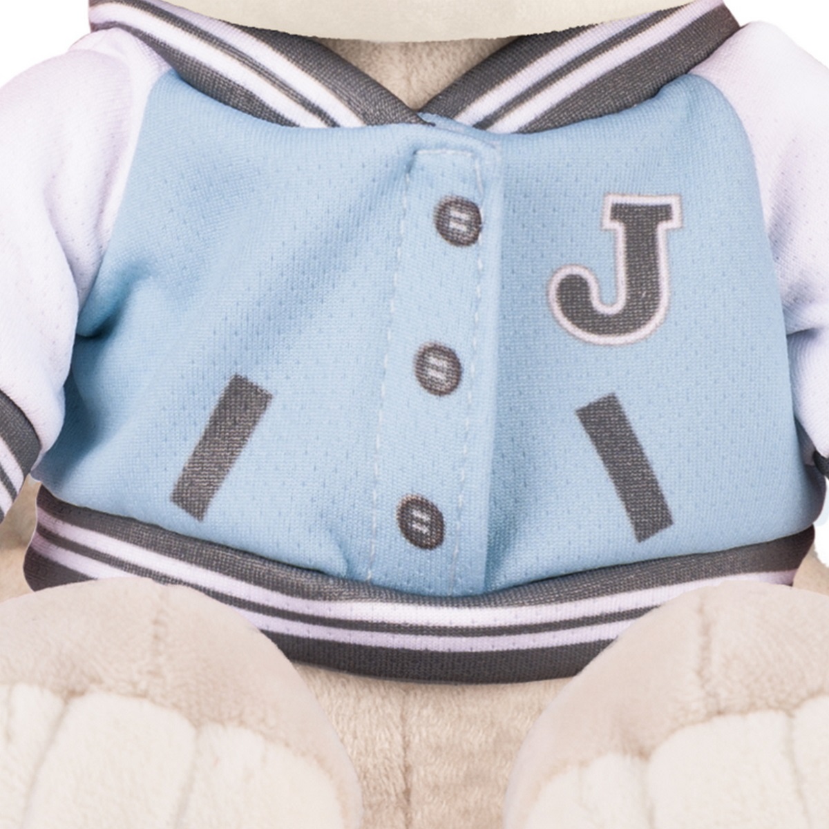 Голубой бомбер – вещь сама по себе приятная и для глаз, и для тела. А рукава, оформленные в другом цвете, делают его ещё более модным и разбавляют однообразие цвета вместе с кромками на рукавах, горловине и подоле. Жак из серии JACK&LIN добавил лишь один нюанс: букву «J» у плеча, и бомбер получился запоминающимся и индивидуальным для зайчика.