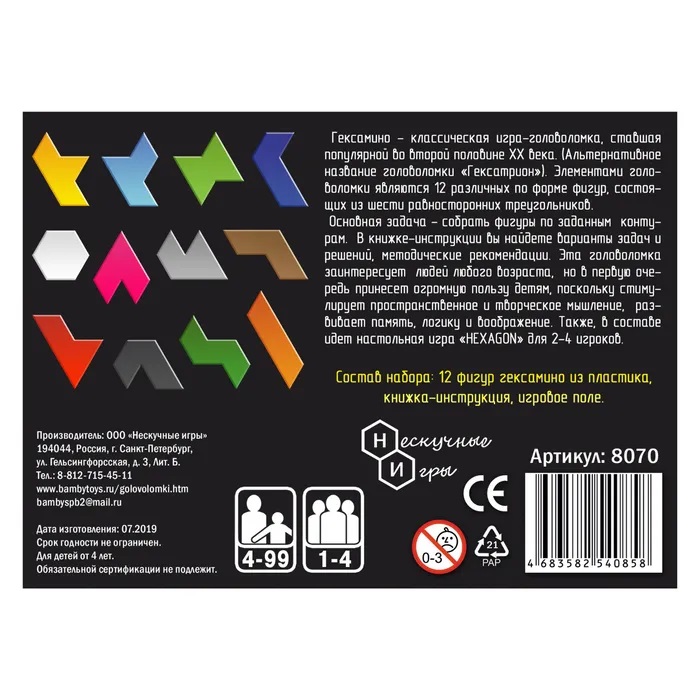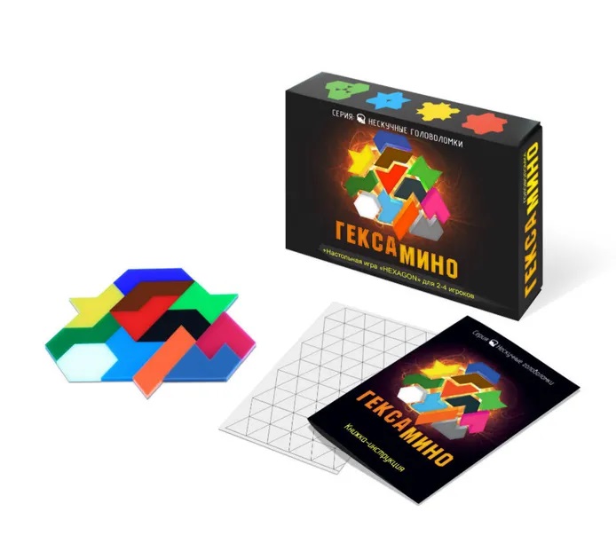 Гексамино - классическая игра-головоломка, ставшая популярной во второй половине ХХ века. (Альтернативное название головоломки «Гексатрион»). Элементами головоломки являются 12 различных по форме фигур, состоящих из шести равносторонних треугольников. Основная задача - собрать фигуры по заданным контурам (принцип решения схож с головоломками Танграм и Пентамино). В книжке-инструкции вы найдете варианты задач и решений, методические рекомендации. Эта головоломка заинтересует людей любого возраста, но в первую очередь принесет огромную пользу детям, поскольку стимулирует пространственное и творческое мышление, развивает память, логику и воображение. Также в составе идет настольная игра «HEXAGON» для 2-4 игроков.