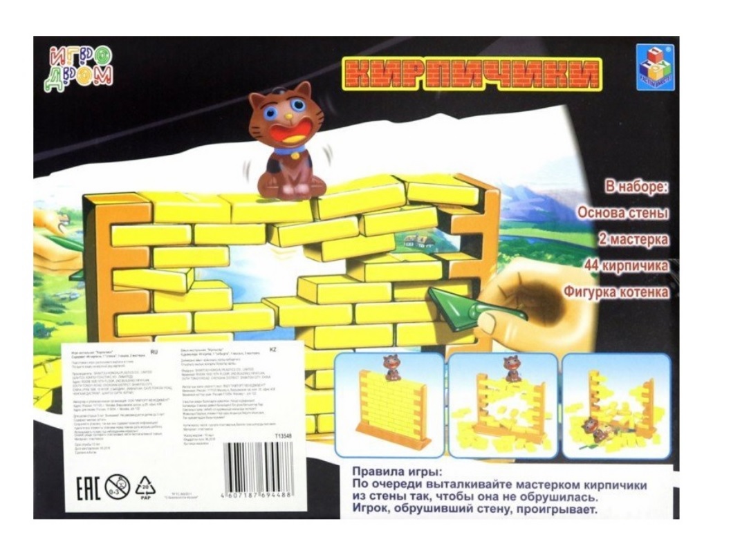 В комплекте: основа стены, 44 кирпичика,2 мастерка, фигура котенка.