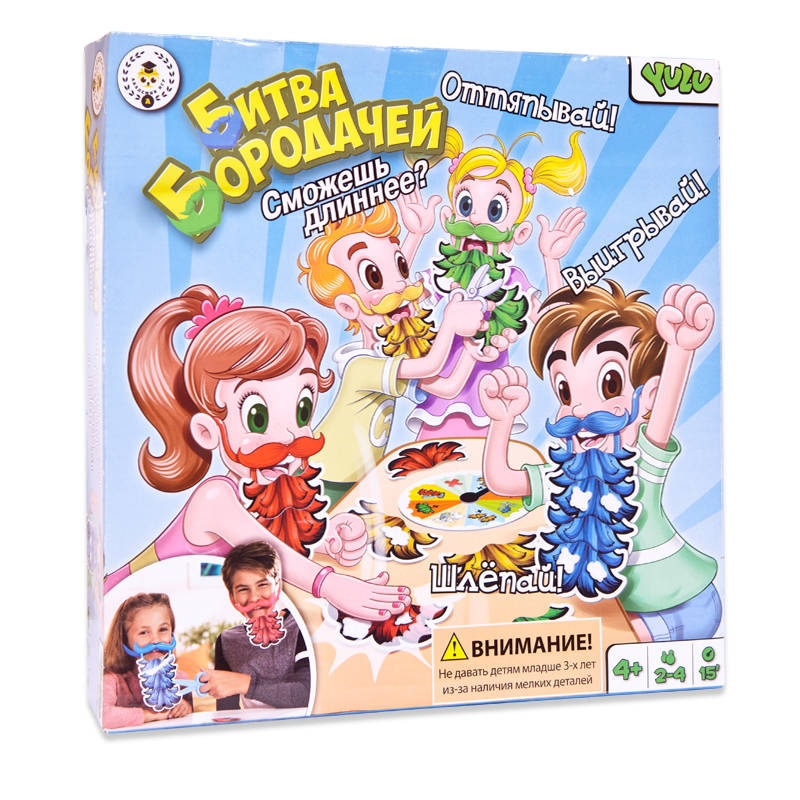 Настольная игра «Битва бородачей» разнообразит досуг компании детей или всей семьи. Играть в неё будет интересно и ребёнку от 4-х лет и взрослому. Рассевшись за круглым столом, игроки надевают накладные усы и веселье начинается! Отпусти самую длинную бороду и тогда ты окажешься победителем!