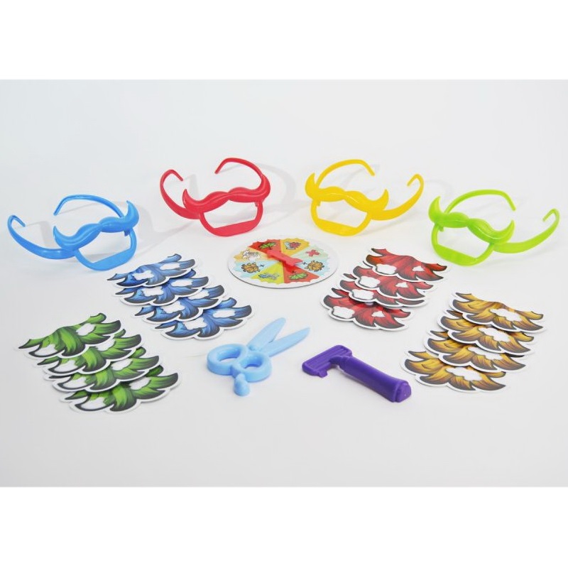- Настольная игра рассчитана на небольшую компанию детей от 2-х до 4-х человек и представлена картонными карточками, на которых изображены части бороды, а также пластиковыми ножницами, бритвой и 4 парами усов.