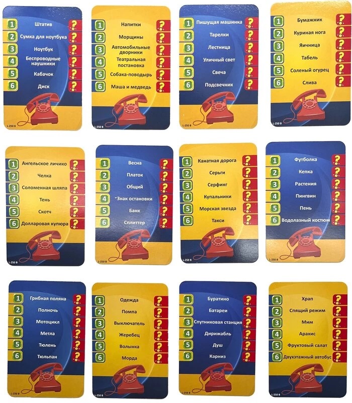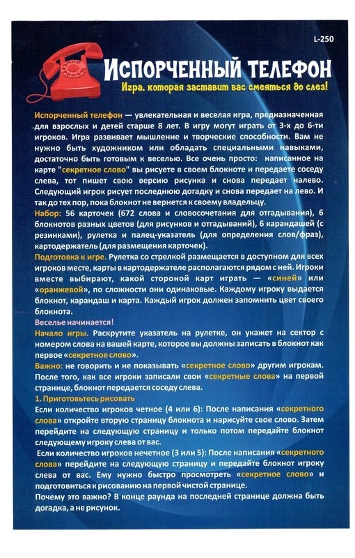 Испорченный телефон - увлекательная и веселая игра, предназначенная для взрослых и детей старше 8 лет. В игру могут играть от 3-х до 6-ти игроков. Игра развивает мышление и творческие способности. Вам не нужно быть художником или обладать специальными навыками, достаточно быть готовым к веселью. Все очень просто: написанное на карте "секретное слово" вы рисуете в своем блокноте и передаете соседу слева, тот пишет свою версию рисунка и снова передает налево. Следующий игрок рисует последнюю догадку и снова передает на лево. И так до тех пор, пока блокнот не вернется к своему владельцу.